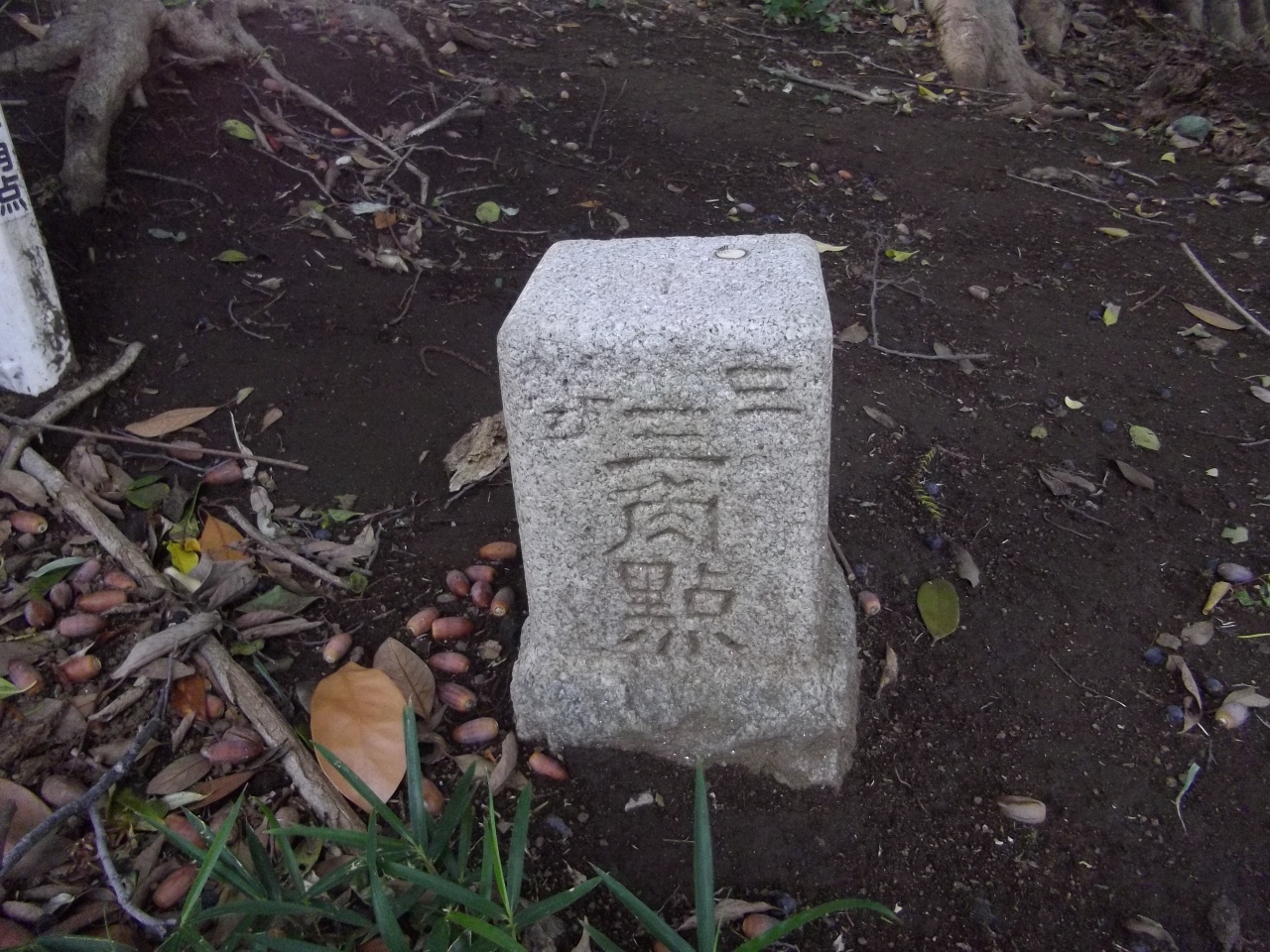静かな住宅地の中にあり、そこそこ風格が感じられました。「伊勢参宮紀念碑」「橿原神宮」の石碑が並び、石灯籠には「安政四年」(1857年)の文字が刻まれていました。国土地理院「三等三角点」の標柱も見つけました。