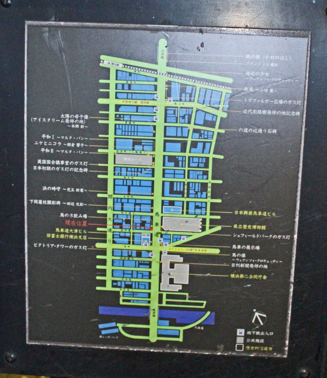 通りには、地図と歴史的な建物の配置を描いた図やガス灯なども設置されています。横浜正金銀行だった神奈川県立歴史博物館や、旧生糸検査所の第二合同庁舎など味のある建物があります。