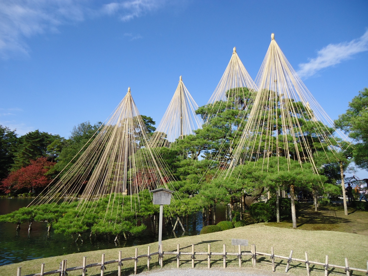兼六園では毎年11月1日 から雪吊りを行います、これは雪害から樹木を守るためです。