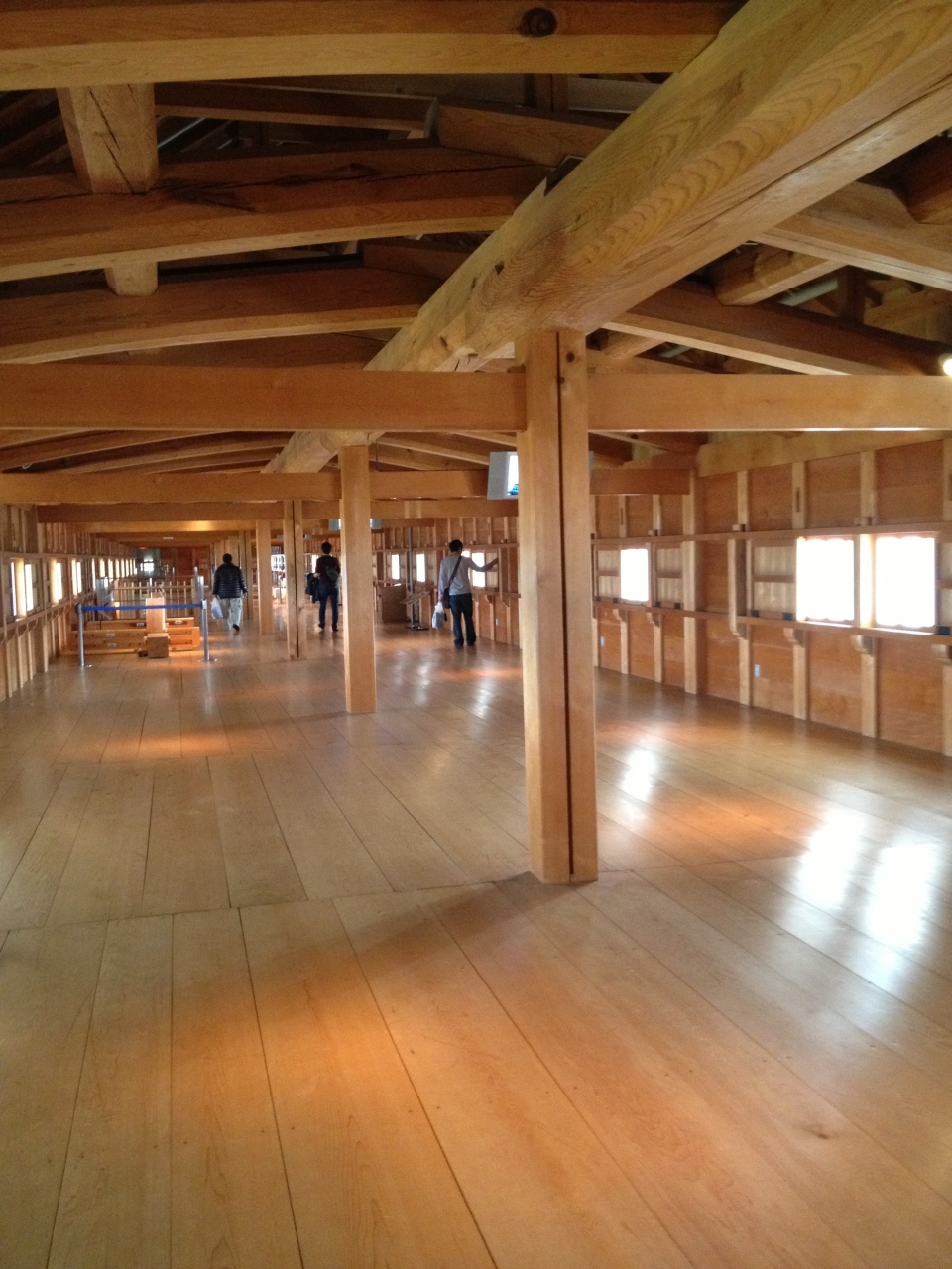 国内最大級の木造城郭建築物だそうです。釘やボルトなどを使わない昔の製法で再建されていて、菱櫓と橋爪門続櫓につながっていて広~いです。外からの眺めも壮観ですが、内部もなかなかでした。