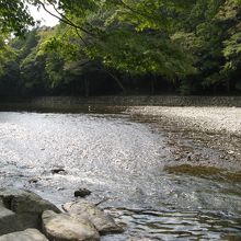 内宮の大鳥居をくぐって五十鈴川をまたぐ宇治橋を渡り終り、白い砂利の敷き詰められた参道をしばらく行き、一ノ鳥居をくぐると、右手に五十鈴川の御手洗場へ下る道があります。五十鈴川は底の小石まで見透かせる綺麗な川で、水に手を浸すと、身も心もリフレッシュしたような感じがしました。