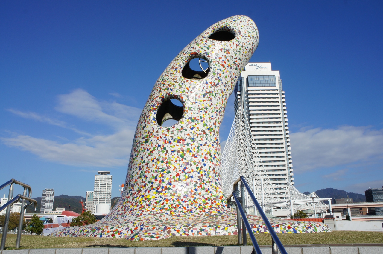オルタンシアの鐘は、メリケン波止場の中ほど。巨大なモニュメントですが、これは「第1回神戸ファッションフェスティバル」の開催を記念して、平成2年に設置されたものです。バックの神戸ポートタワーや神戸海洋博物館と一体で眺めると迫力が増すように思います。