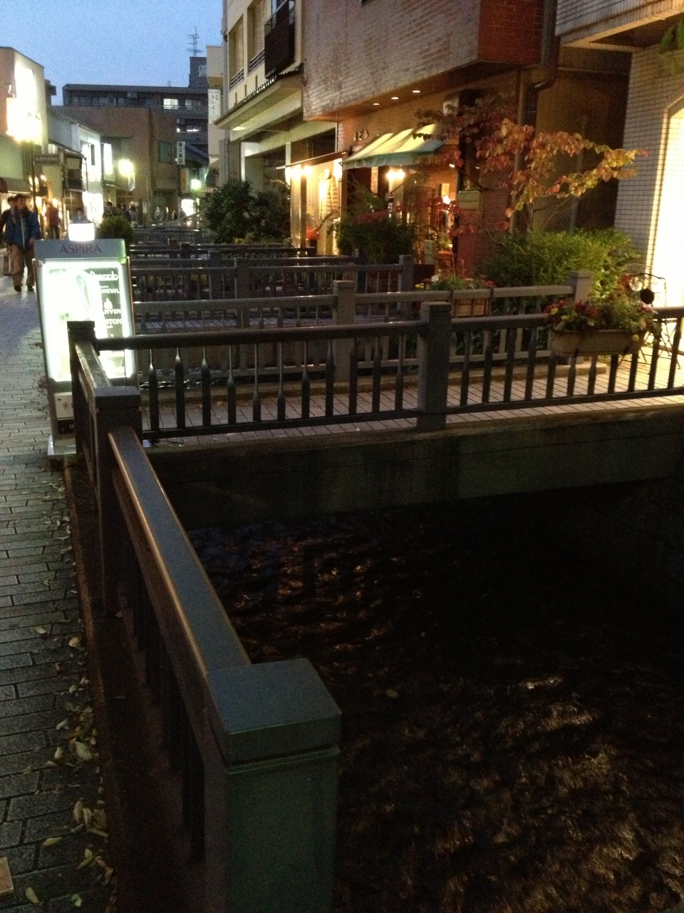 加賀藩政時代には大野庄用水と同様に町中の生活用水、防火用水と併せて金沢西北郊外13カ村、8千石を潤す大用水でもあったそう。現在は香林坊109の裏手や繁華街の中を流れています。流れに勢いがあり、その水は澄んでいました。用水に沿って遊歩道が整備され、夜はまた違う雰囲気がありました。