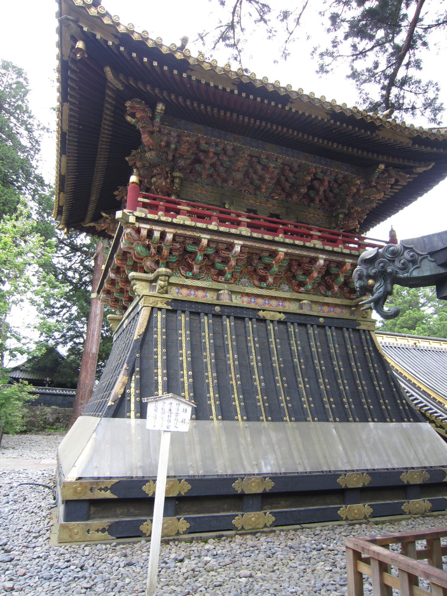 陽明門を下手側からみて手前右手にあるのが、この鐘楼。鼓楼と左右で対になっていますが、それぞれに別の目的で建てられています。そのことから、建物の装飾も異なっています。