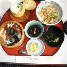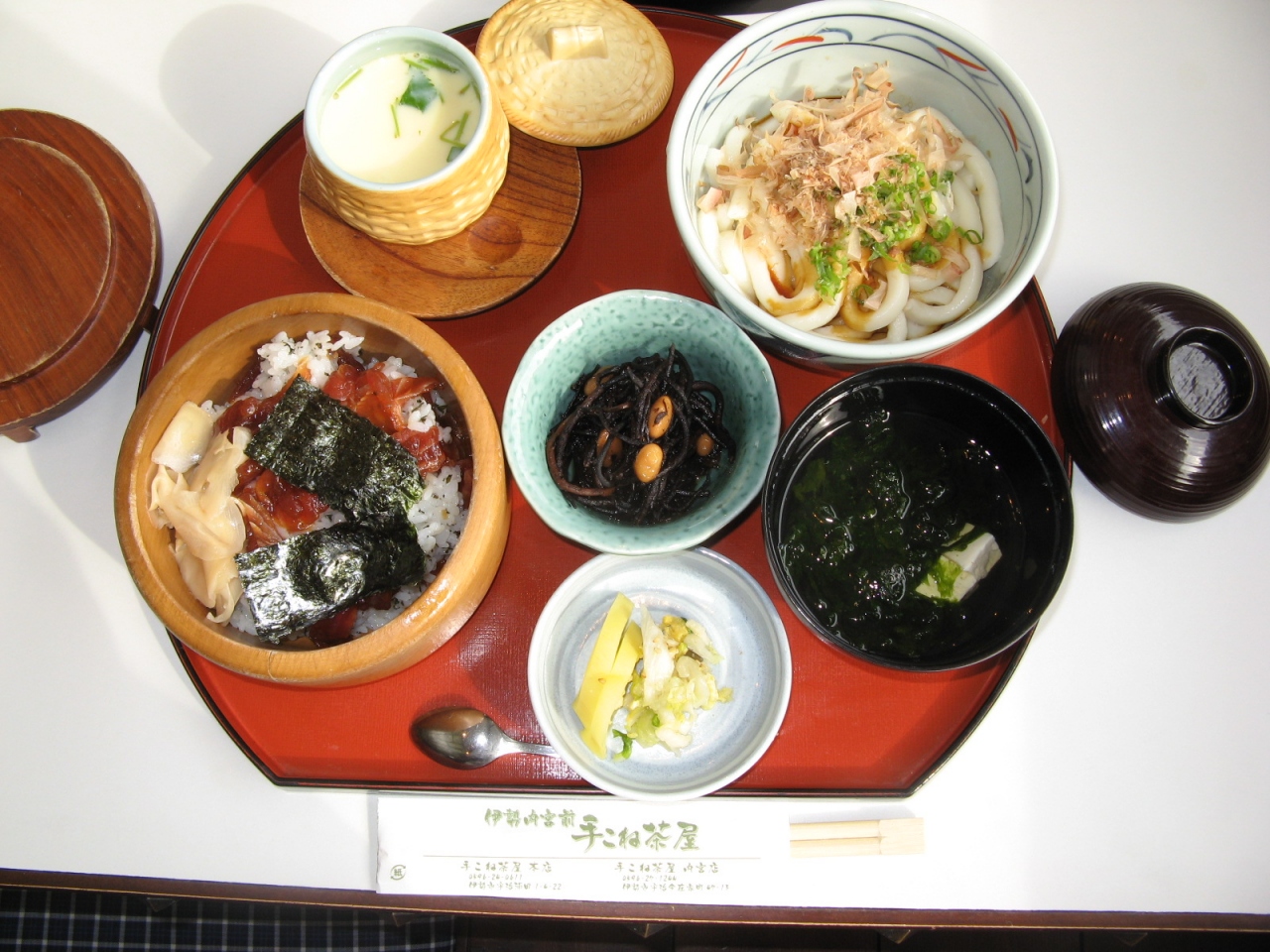 「手こね茶屋本店」さんは、伊勢道路(県道32号線)が五十鈴川を越える橋の袂にあります。1階が駐車場、2階がお店の大きなお店です。伊勢神宮を参拝した帰りに、伊勢うどんを食べたくて寄せてもらいました。“名物あわせ”を頂きました。手こね寿司に伊勢うどん、茶碗蒸し、小鉢、汁物がセットになって1470円でした。うどんは独特のもちっとした食感で美味しかったです。