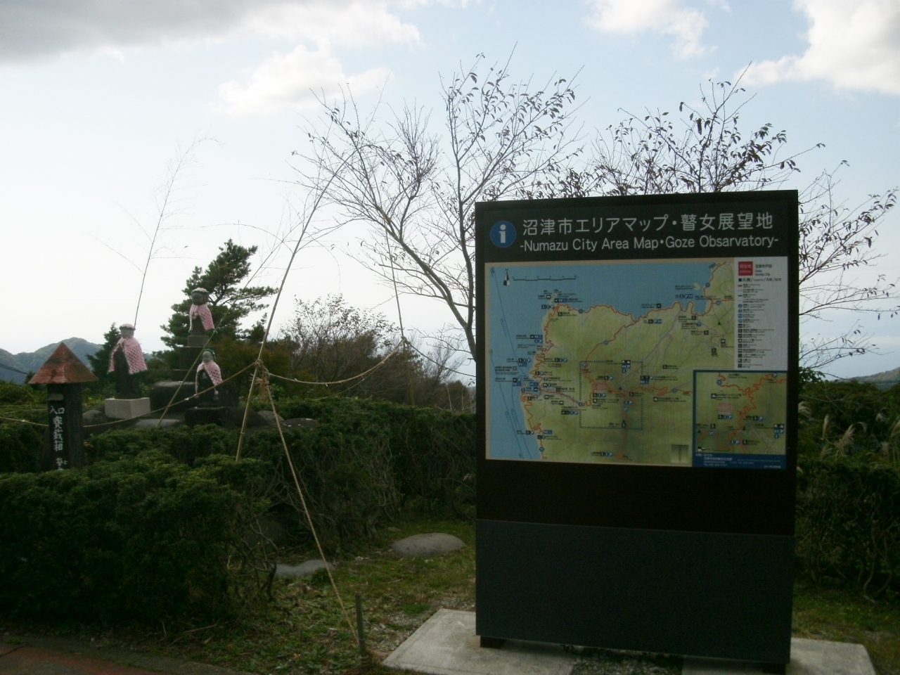 展望台の傍に瞽女(ごぜ)観音と呼ばれるお地蔵様が鎮座されています。瞽女とは,三味線を弾き語る盲目の女旅芸人のことで、かつて、この峠の山道で大雪に遭い亡くなった瞽女の冥福を祈るため建てられたものです。芸道の祖として知られる瞽女を象徴するものとして、古くからこれを拝むと芸道が上達すると言われ、芸能人の信仰が厚いそうです。広い駐車場があるので、戸田~修善寺間を通るときは、休憩がてら、立ち寄られることをオススメします。