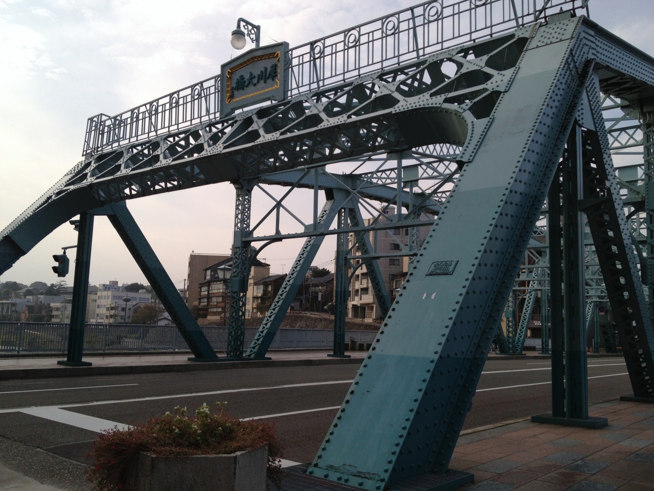 国道157号線を香林坊からにし茶屋街へ向かう途中の犀川にかかる鉄橋です。1924年に架橋され、現在は国の登録有形文化財に指定されています。早朝は車も少なく、犬の散歩や、ランニングをしている人が見られました。橋上から川の流れをのんびり見るのも良いですね。