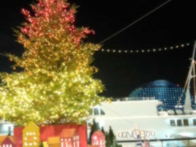 海側のテラスには暖色系のクリスマスツリーが飾られていて