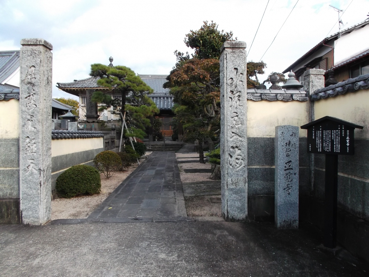 寺町の通り沿いの石柱のある三門から奥まったところに、菊花紋瓦の山門そして本堂があります。曹洞宗・持地山が山号の正覚寺。