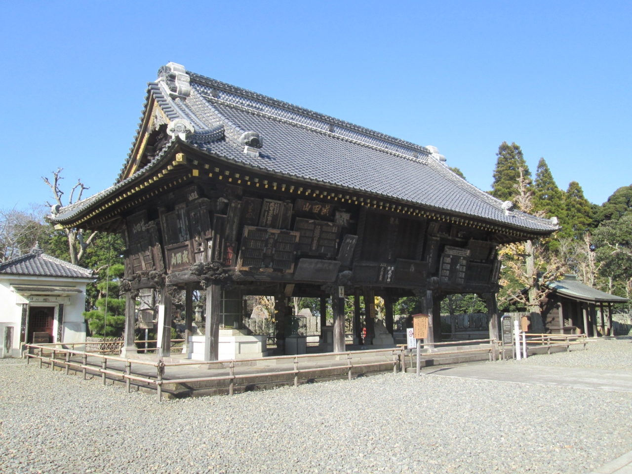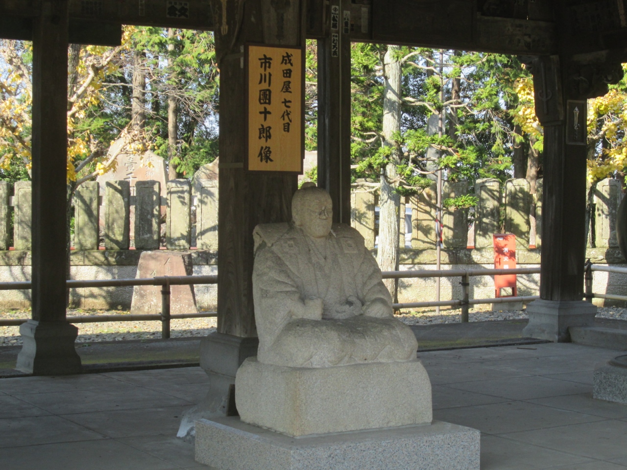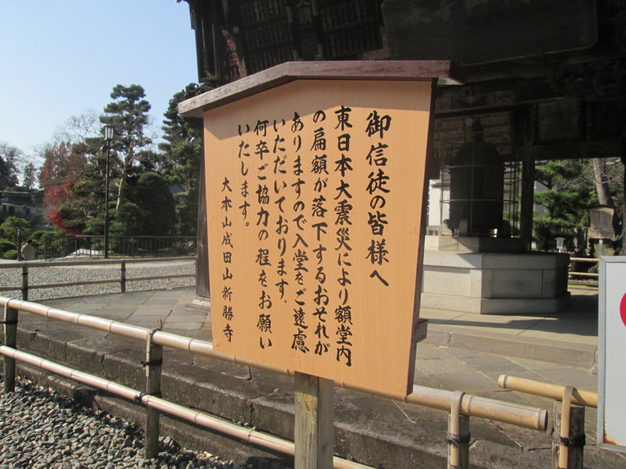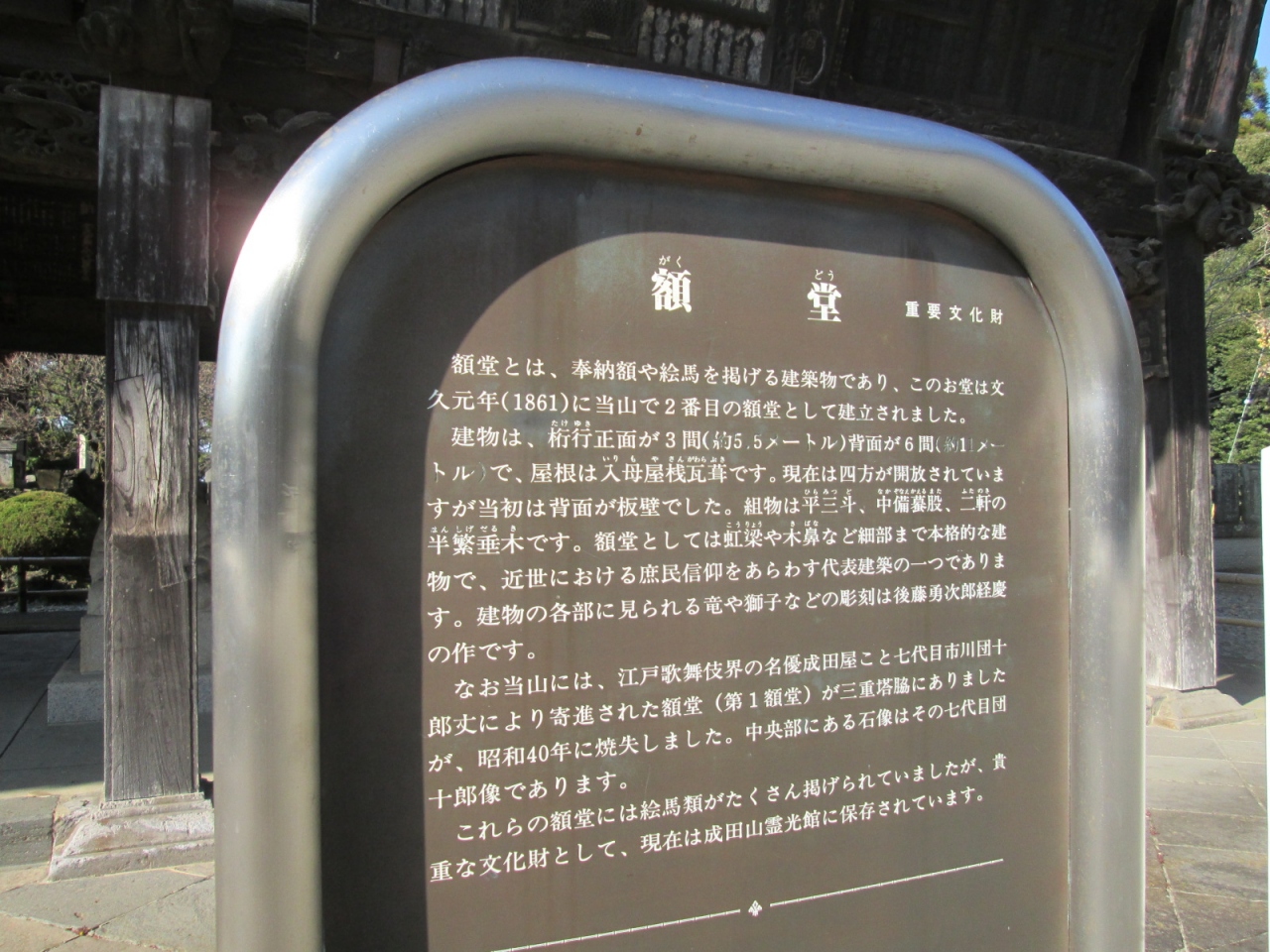 「新勝寺」境内にある国指定重要文化財の一つです。「額堂」という建物は初めてなので、始めはどのような建物か分かりませんでした。「成田観光館」でいただいたパンフレットを読むと、信徒から奉納された額や絵馬をかける建物ということ、さすが民間信仰が盛んであった成田山らしい建物であると納得しました。さて建物は江戸時代末期の1861年に建立されたもので趣きがあります。形状は柱の上に屋根が乗っかり、壁がないため、一見すると高床式の建物のようです。内部には「成田屋・七代目市川団十郎像」や「青銅製大地球儀」(明治40年)もありますが、東日本大震災の影響で”額堂内の扁額が落下する恐おそれがある”ということで御堂の中に入ることができなかったことは残念でした。