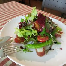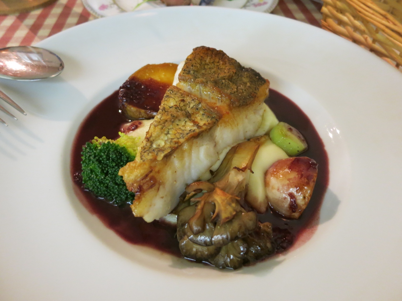 前菜は、白レバーのムースや舌平目のフリットのサラダなどがありました。ホタテと生ハムのサラダ(¥945円)は肉の衣を巻いたホタテの味わいがなかなか美味しく、サラダがちょうどよくバランスをとってくれます。また、マダラのポワレ(¥1,260円)などもよく煮込まれたマダラやジャガイモなどに甘酸っぱいワインソースのかかった逸品でした。