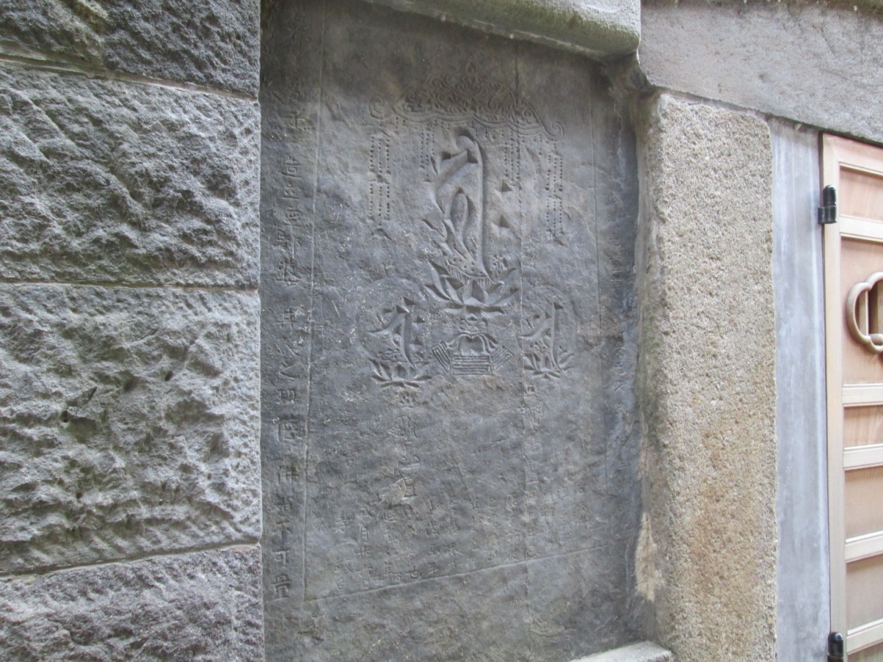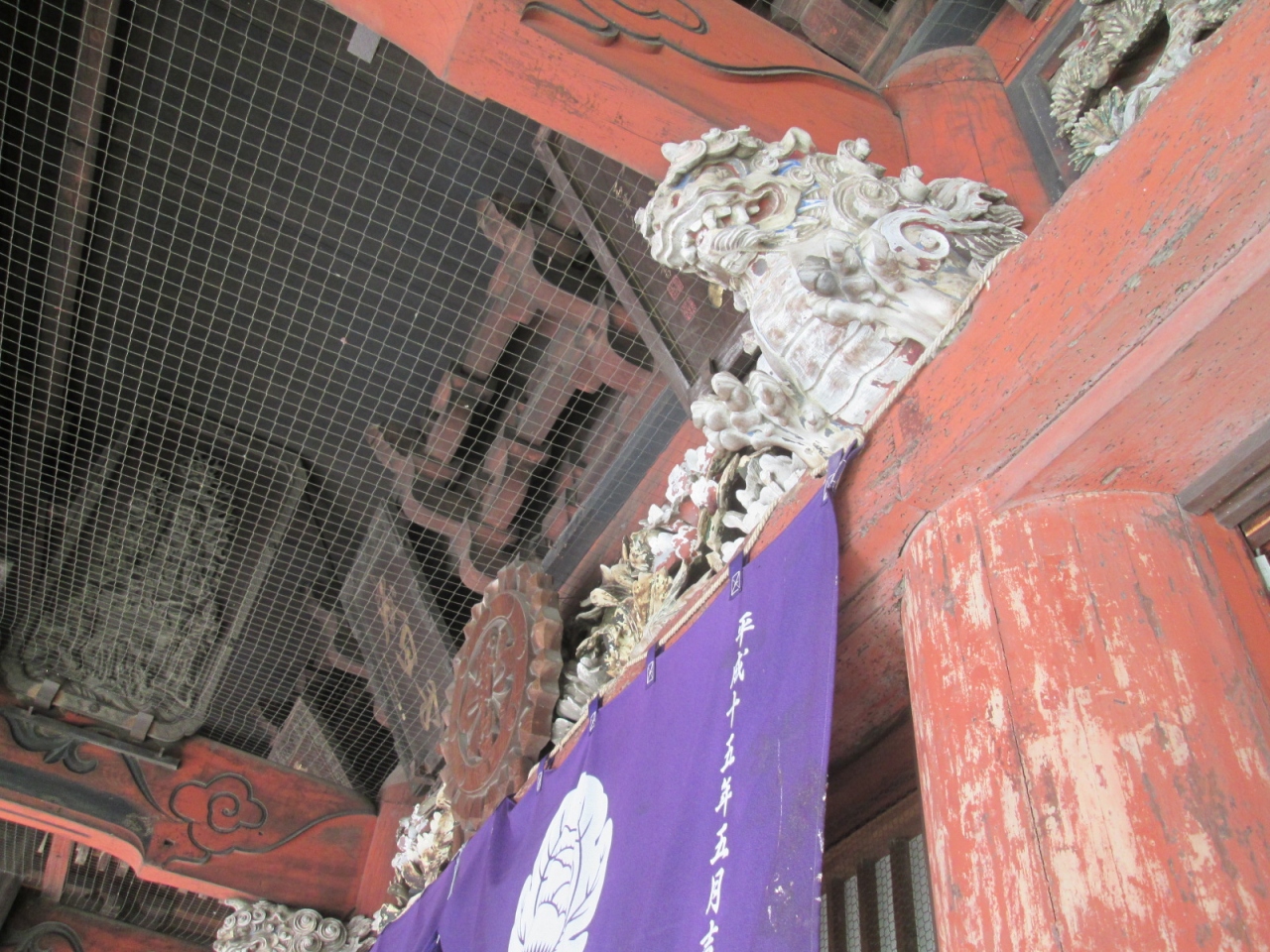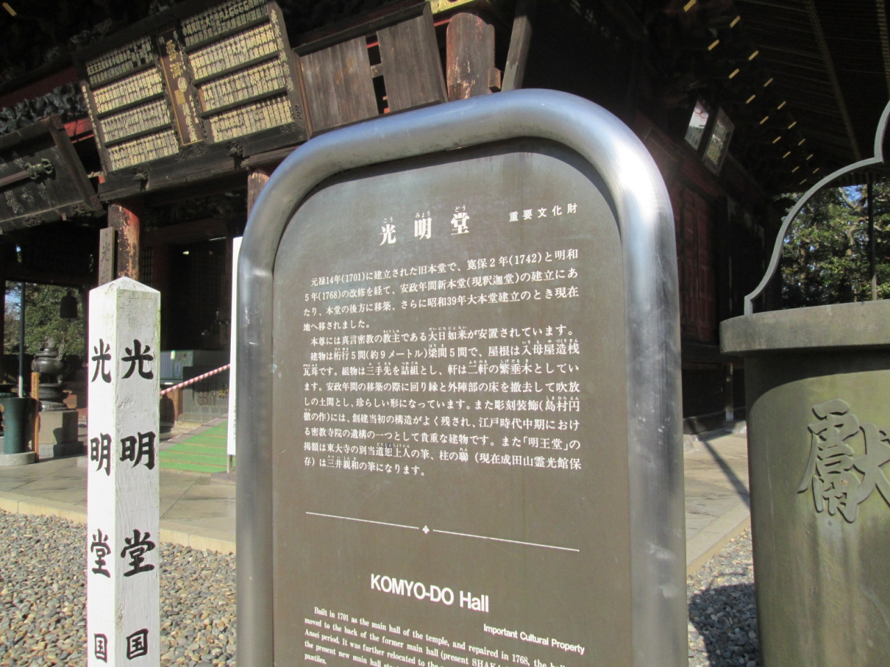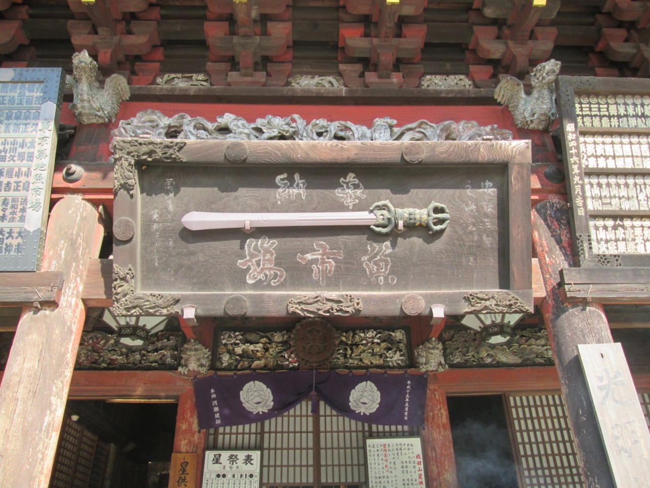 かつて成田山の本堂であった建物で、国指定重要文化財です。建立は元禄14年ということですから、赤穂事件のきっかけ…江戸城松之大廊下において、浅野長矩が吉良義央に刃傷におよんだ年ですね。それだけの月日が経っていますので、建物外観もかなり経年劣化が進んではいます。ただ御堂上方の彫刻など、色は落剝していますが、素晴らしいです。