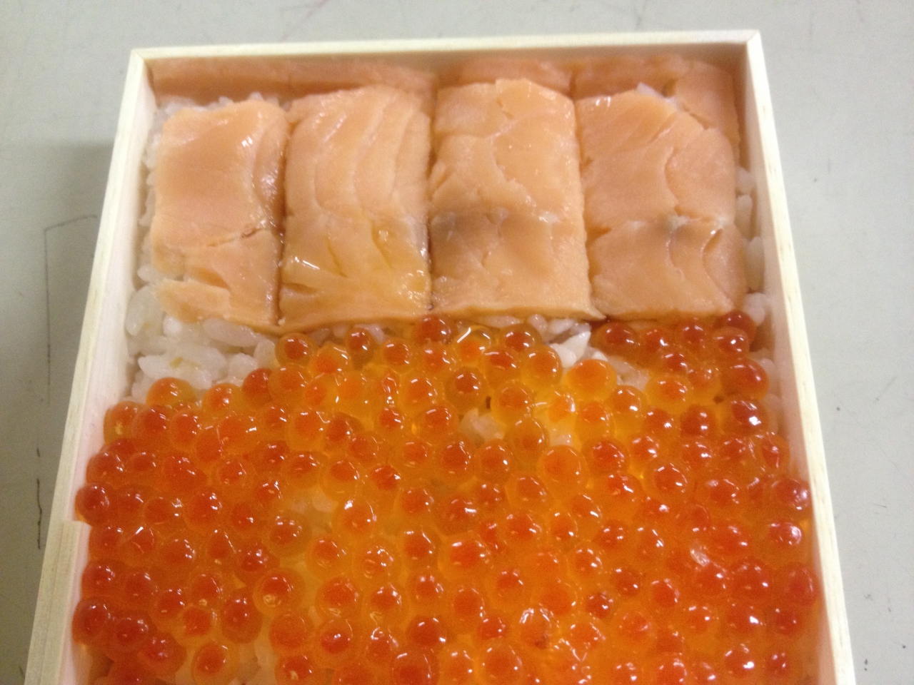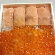 鮭よりもイクラのほうがふんだんに使われていて、押しずしのような感じです。ご飯の食感を残すためにも、鮨ではなくて鮭いくら丼のほうがいいのになと思いました。