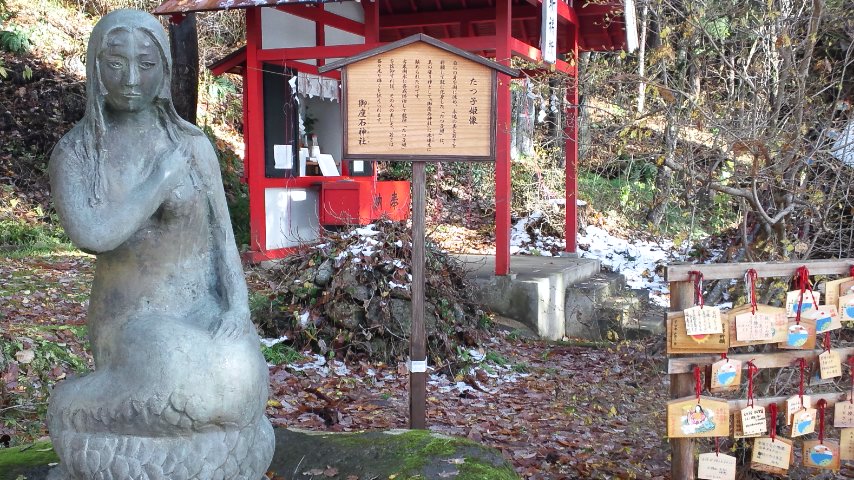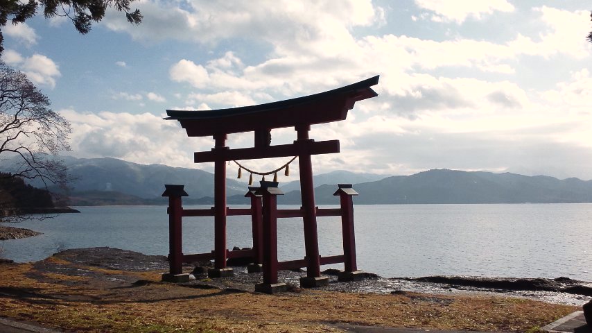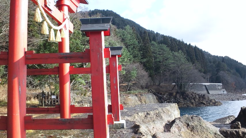 12月に行ったのですが駐車場の前にあるトイレは閉まってました。売店も併せて営業していなかったです。湖畔沿いにある神社で赤い大きな鳥居が目立ちます。神社内ではお守りの販売やおみくじを引くことが出来ます。神社内には「たつこ姫像」があります。
