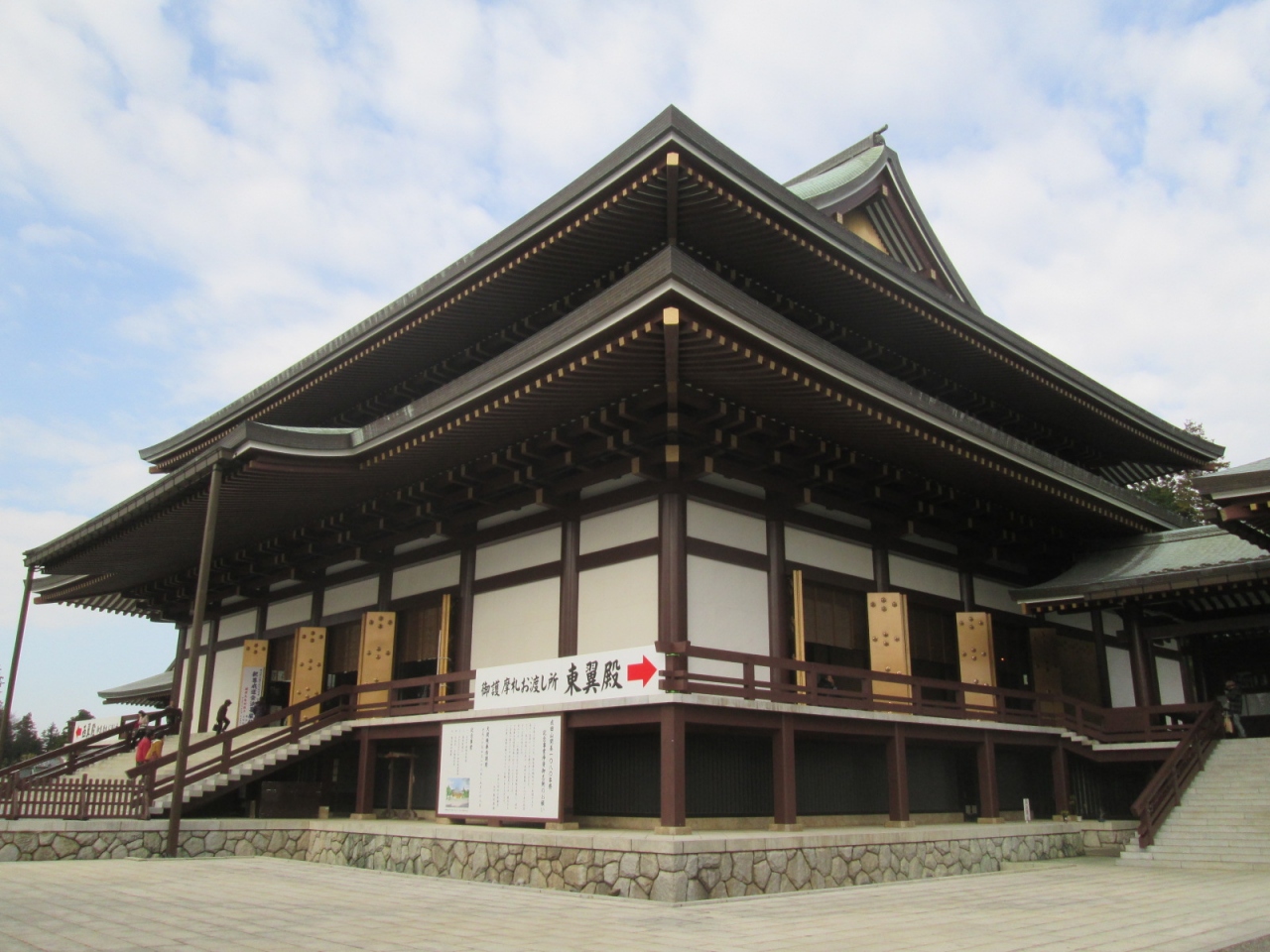 昭和43年(1968年)に建立された建物ですから、歴史こそないものの、「新勝寺」の中心道場に相応しい大きくて立派な建物です。正面から入るとお賽銭箱、その奥の堂内はガラス張りとなっており、お賽銭箱に立つことで御本尊様を目の前にお祈りができます。もちろんガラス扉を開けて堂内に入ることもできます。本堂左右にある「東翼殿」・「西翼殿」は御護摩札やお守りを受け取る場所になっています。