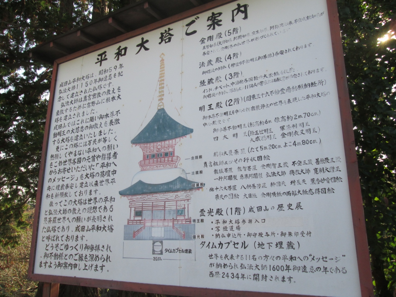 電車などで成田方面に向かうと、成田山の頂上付近に建つ立派な塔が目に入って来ます。今まで「あれは何の塔なんだろう?」と思っていましたが、「平和大塔」だったのですね。昭和59年建立の建物で、高さは58メートルと、かなりの高さがあります。1階から内部に入ると、その右手は成田山の歴史展で、成田山の生い立ちなどを勉強することができました。2~5階にもそれぞれ掛仏や曼荼羅などが掲げられ、地下は弘法大師1600年忌の2434年に開封されるタイムカプセルになっています。ただ「新勝寺」境内にある伽藍の中でも、最も奥まった場所にあるため、訪れる人は多くはないと感じました。