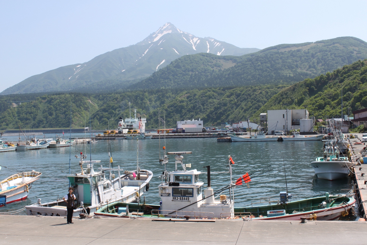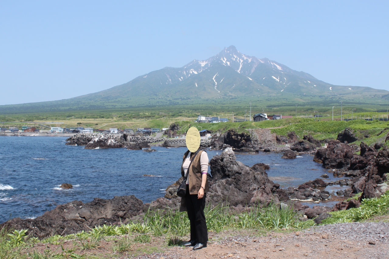最初に目に入ったのは稚内からのフェリーから。小さかった山が島に近づくに連れ、どんどん大きくなってきました。青い空と雪をかぶった山、周りは海、本当に姿の良いきれいな山でした。