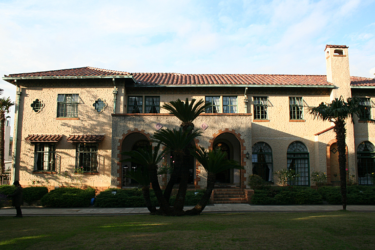 横浜山手に建つ洋館の中でももっとも規模が大きいものです。広い前庭と明るい色の南国風の外観は開放的な雰囲気。大きな煙突がありますが、装飾かな? 向かって左側に並ぶ2つの小さな窓は面白い形をしていて、建物の目のように見えます。