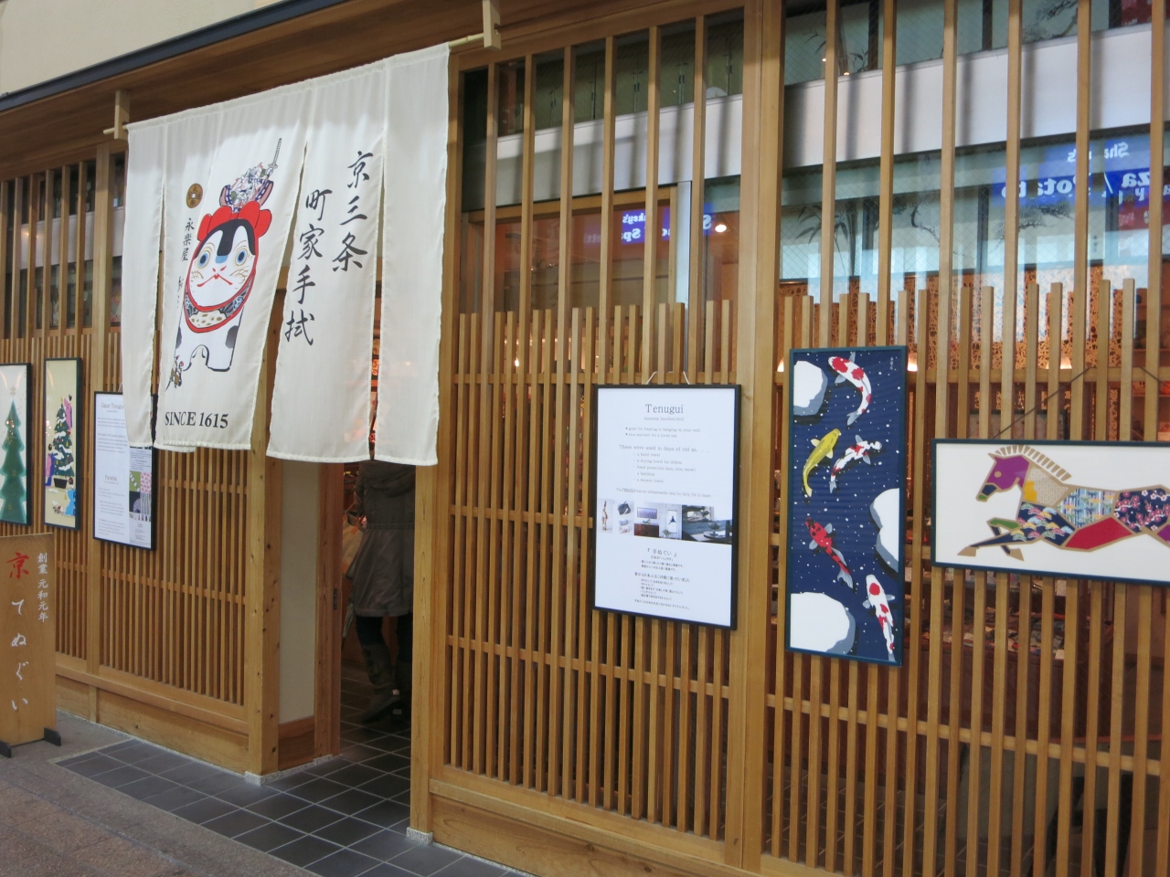 元和元年(1615年)創業の手ぬぐい店で新京極三条店も含め京都に6店舗ある。手ぬぐいは伝統的な金魚や、竹などの絵柄から、祇園祭り、花火などの季節柄など色とりどりの手ぬぐいがある。面白いがらはガイゴツの絵柄がありました。手ぬぐいのほかにも風呂敷、ハンカチなどもあります。