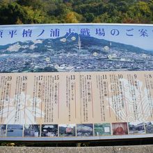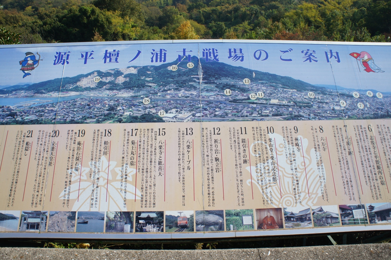 源平屋島合戦の史跡といっても、屋島の辺り一帯が古戦場なのですが、敢えて言えば、屋島ドライブウェイの途中には屋島から広く周囲を見下ろせる場所に「源平屋島古戦場」の標識があります。それと、屋島の上だと、瑠璃宝池(血の池)。源平合戦の時、義経はじめ源氏の平が血刀を洗い、池がまっ赤に染まったと伝えられます。
