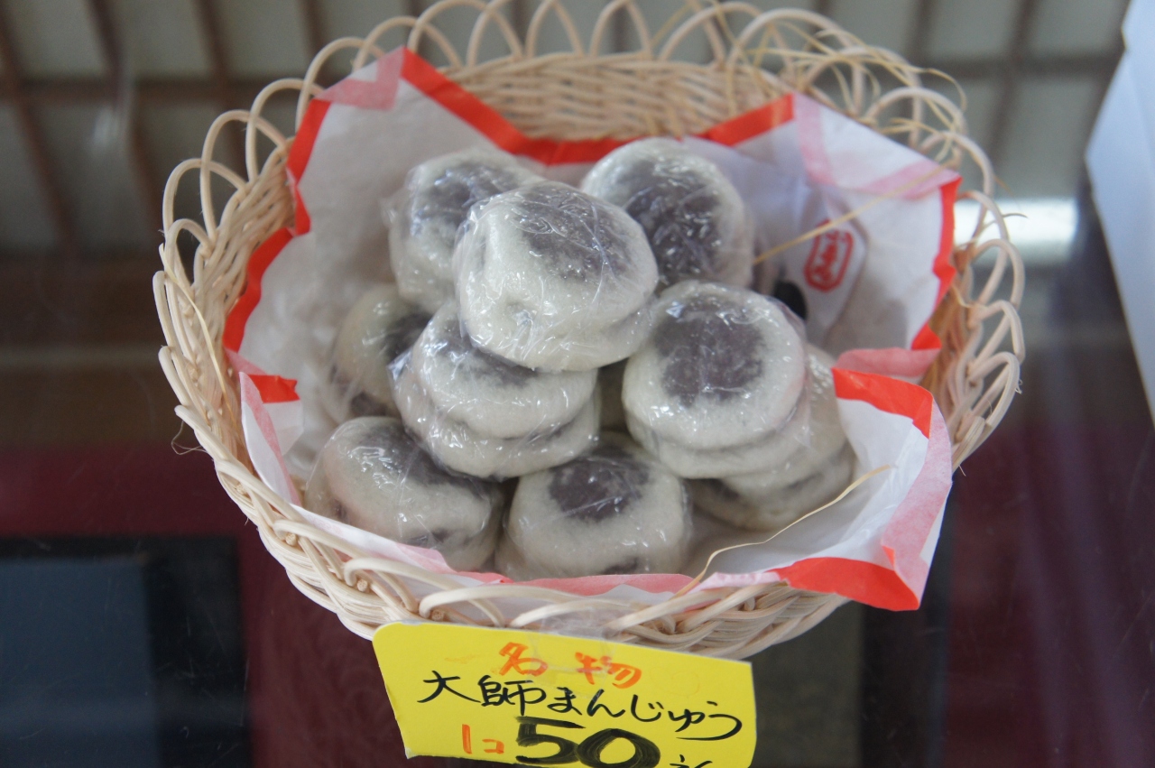 岡田長栄堂本店は、土庄港から降りてすぐの土庄港観光センター向かい。大師まんじゅうという大きな看板が見えたので寄ってみました。まんじゅうを蒸かしていり湯ががもうもうと出ていて、これは期待が高まります。