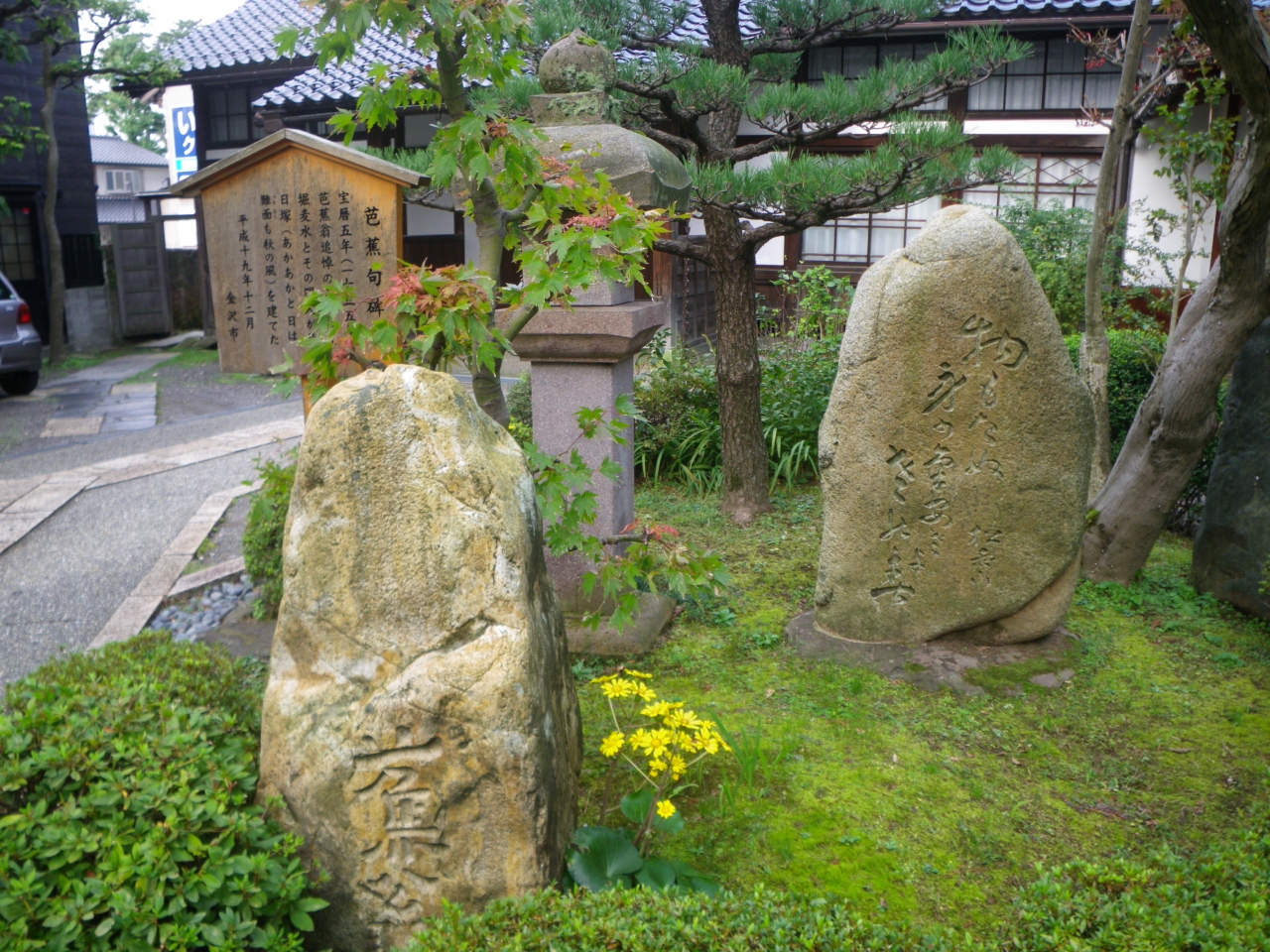 犀川近くの寺町寺院群にある成学寺の境内には、俳人・堀麦水らが建立した「あかあかと日はつれなくも秋の風」の芭蕉の句が刻まれた「蕉翁墳」があります。1765年に作られたもので、金沢で一番古い芭蕉の句碑だそうです。