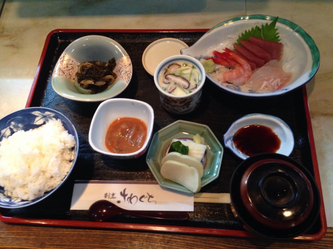 刺身定食を注文。刺身はあらかじめ小鉢にセッティング済みのもの。