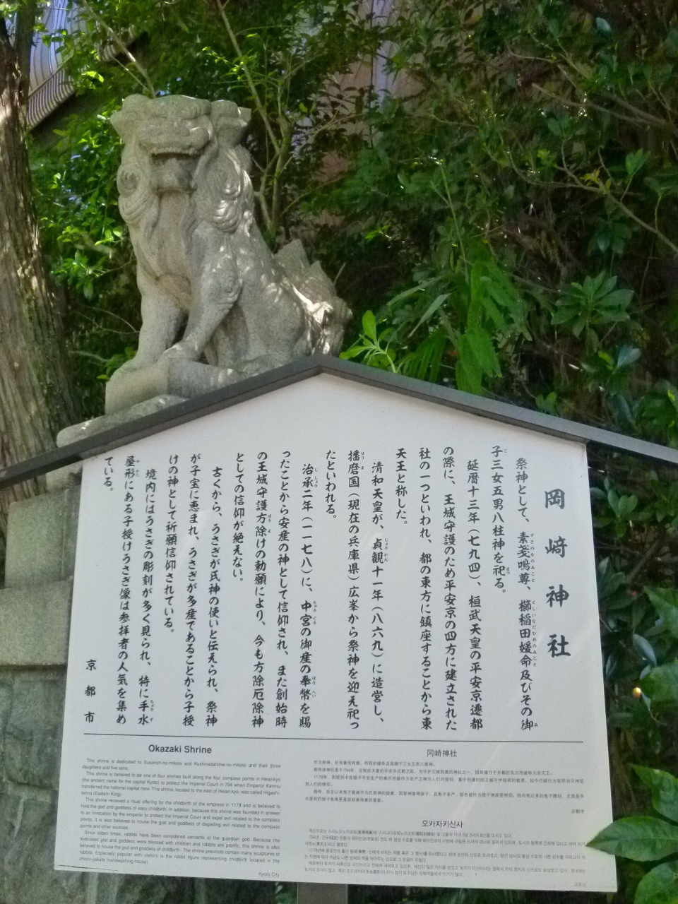 京都左京区にある岡崎神社、いつかは訪ねてみたいと楽しみにしていました。こちらの寺院にはかわいい招きうさぎちゃんがいます。石の鳥居の両側にうさぎちゃんの提灯。古くからうさぎちゃんが氏神の使いに伝えられて、うさぎが多産であることからうさぎをお祀りしているとのこと。とてもかわいいので是非参拝してくださいね。
