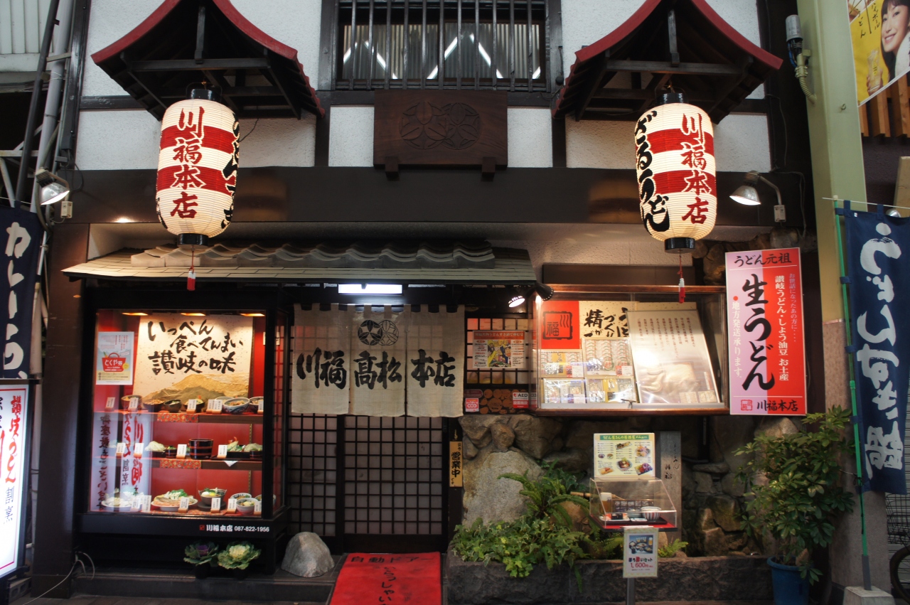 川福は、高松市内の中心、ライオン通りにある讃岐うどんの老舗です。讃岐うどんは、けっこう不便な場所にあって、お店も粗末といったイメージがあるのでしょうか、お店をのぞいていた女性グループが讃岐うどんらしくないお店だよねとかいって通り過ぎて行きましたが、まったく、知らないにもほどがあります。