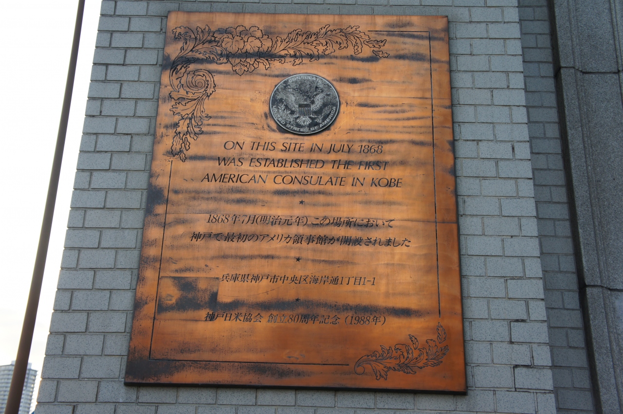 アメリカ領事館の銘板は、海岸通り沿いにある神戸郵船ビルの外壁にはめ込まれていました。想像していたより、けっこう大きなものでした。近くにあるメリケン波止場は、このアメリカ領事館のアメリカに由来するもの。しっかり歴史を刻んでいます。