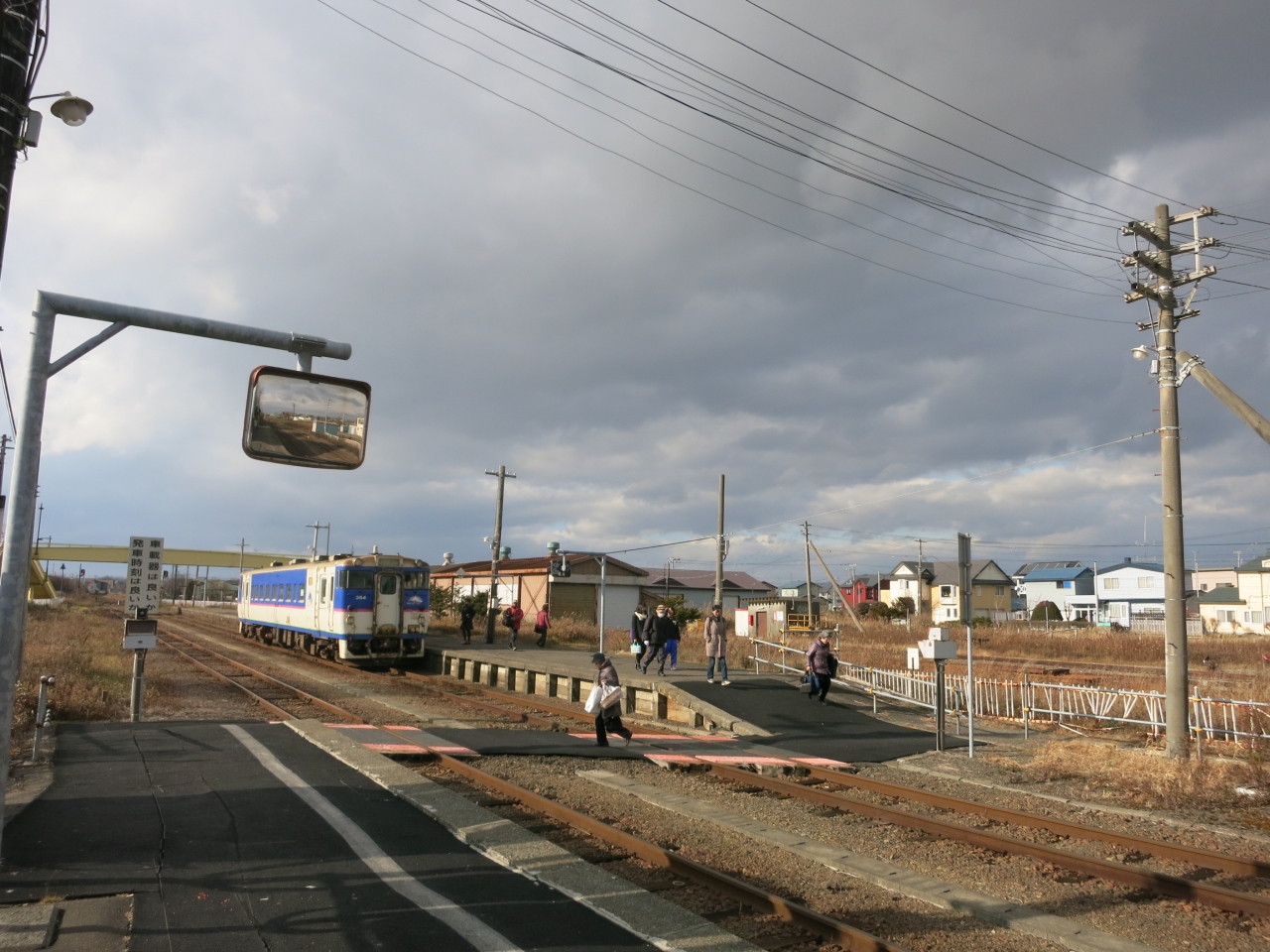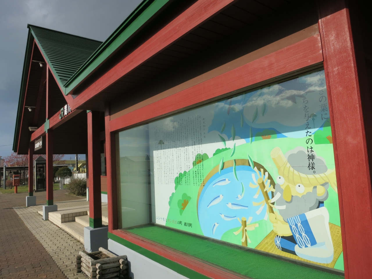 苫小牧から4駅目。30分ほどで到着します。駅は複線で、上下の列車の交換をして少し停車することもありますが、無人駅。シンプルなきっぷの自販機があります。ただ、そば屋(笑家)が駅に入っていて、日曜を除く10:45~14:00の間に行くとそばが食べられます。鵡川の名産、ししゃものそばを出していたり、鵡川産のそば粉や鵡川の地下水を使っていたりと、こだわりの店のようです。