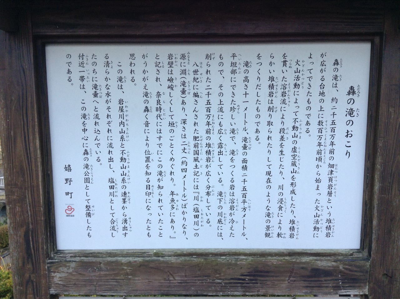 轟の滝は、 塩田川の流れる水の音が、雷のように轟くことからその名がつきました。高さ約11メートル、三段からなる滝で、滝つぼの面積は2500平方メートルあるそうです。周辺は散策路や公園になっていて、ブランコなどの遊具があって、歩行者専用の橋があり、対岸と往き来できます。
