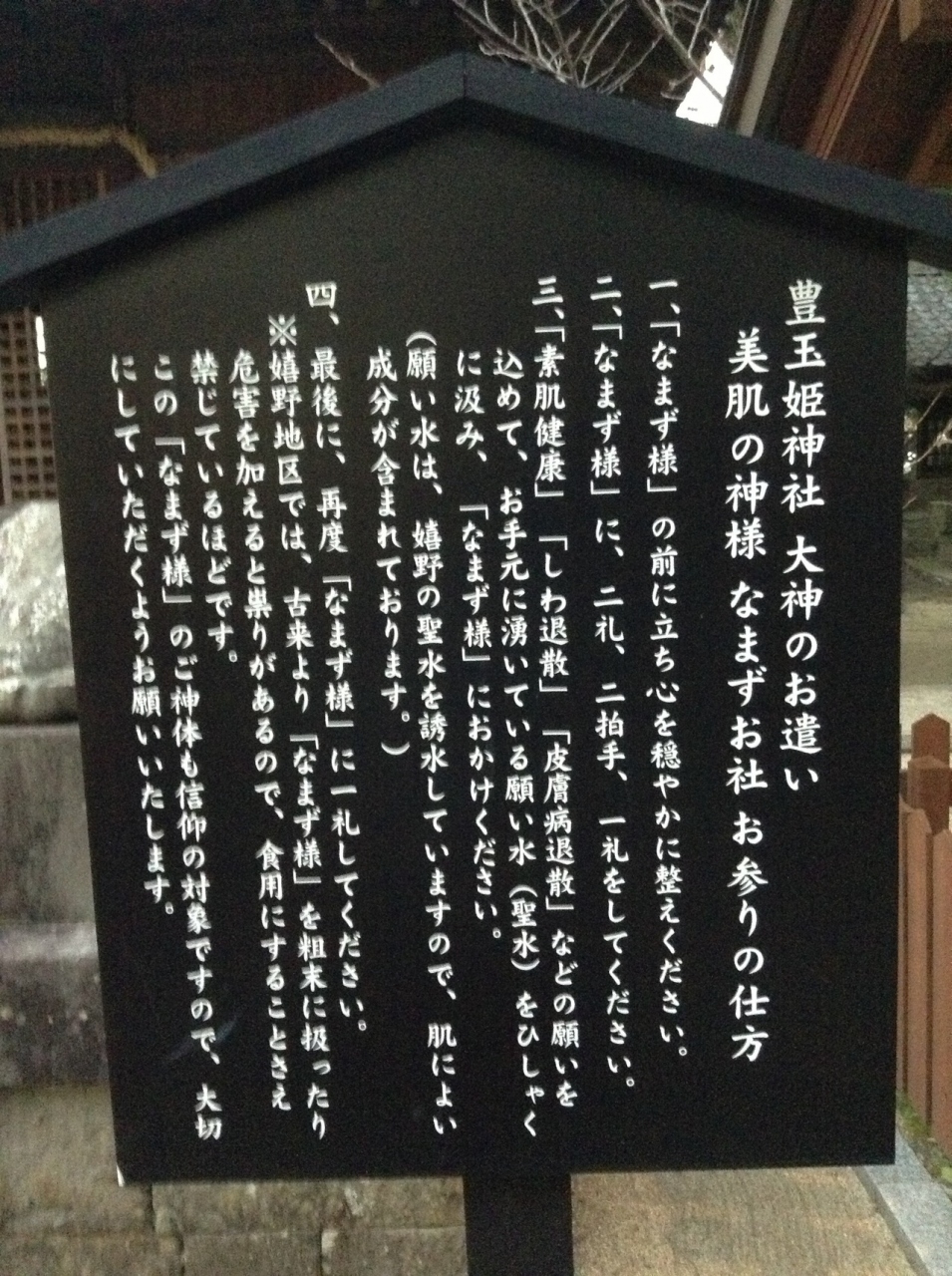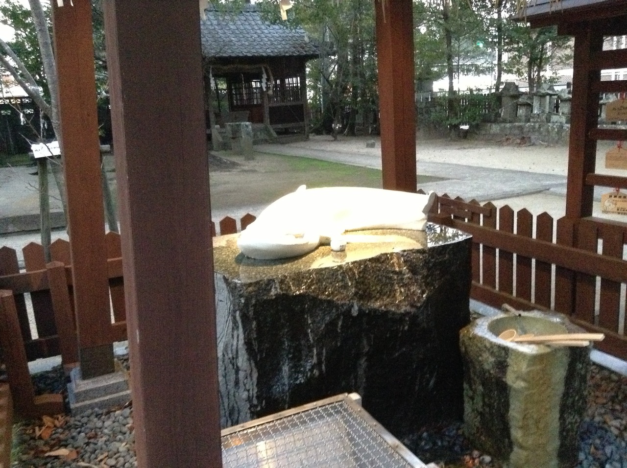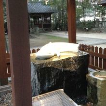 境内の一角に白磁製のつるんっとした白なまず様が鎮座しています。竜宮城の乙姫さまの遣いといわれる豊玉姫が嬉野を訪れた際に、汚れて傷ついていた大きななまずに遭遇し、湧き出る湯を掛けてあげたところ、見違えるように肌が白くツルツルになったという言い伝えがあるようです。この美肌の神様「なまず様」を触れば、同じように白肌美人になれるといわれており、肌に関する願い事が叶うと信仰されています。