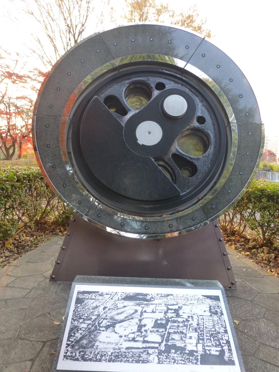 北側には車輪を使った中央鉄道学園記念碑があります。