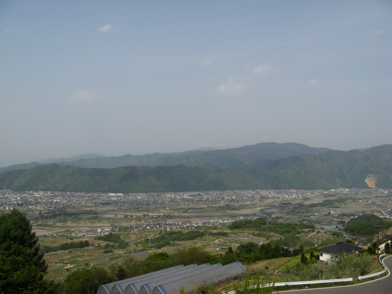 国道403号線の猿ヶ馬場峠を千曲市方面に少し下ったところ、国道沿いにある小さな公園です。小さな駐車場と東屋が整備されており、展望台からは眼下に千曲川をはさみ、田園風景、街並、川中島平を一望で出来ます。5月の初旬に行きましたが、公園は桜が満開でした。周辺にある展望台のうち、最も高い場所にあるため夜景スポットとしても人気があるそうです。