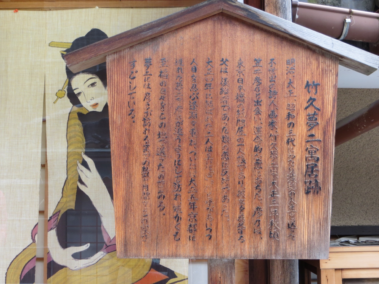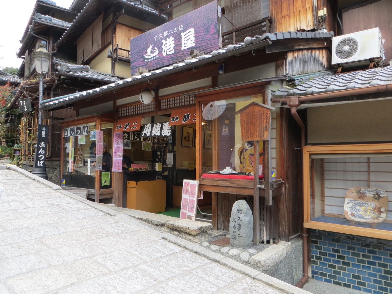 清水寺から産寧坂を下って二年坂へ。二年坂の途中左側にあります。竹久夢二の絵と看板が目にとまり何かと思ってみたらお土産屋さんのよう。今は「港屋」という夢二グッズのお店になっているようです。店先ではきんつばも売られていました。