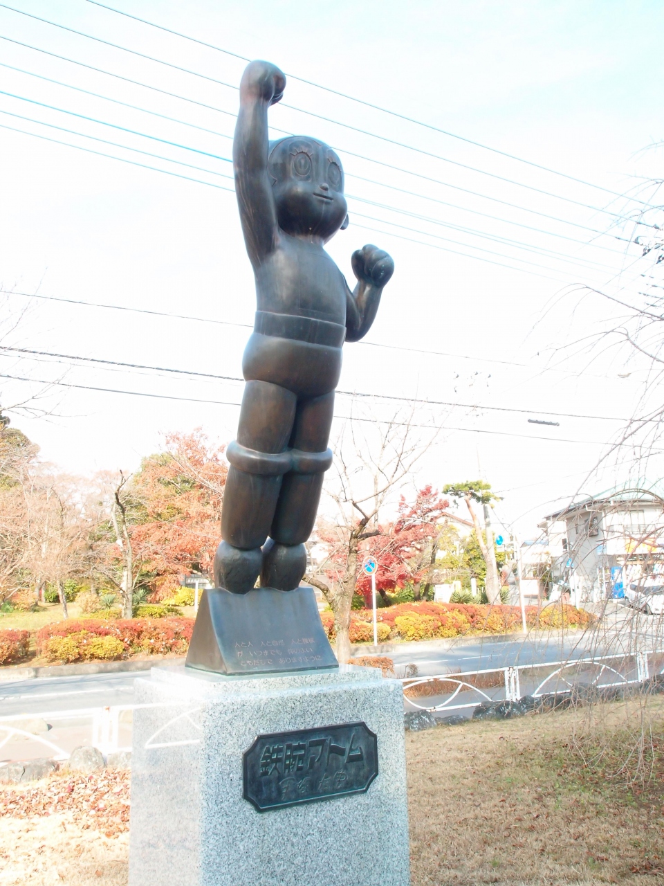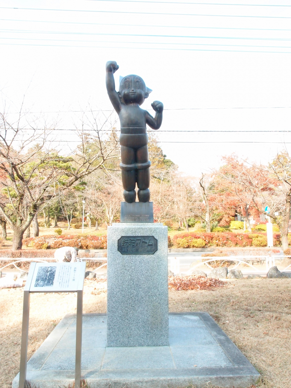 見所はこの桜の他では鉄腕アトムの銅像でしょう。公園の北の隅、県道ぎりぎりの所に置かれていて、能仁寺の南の池から見えます。