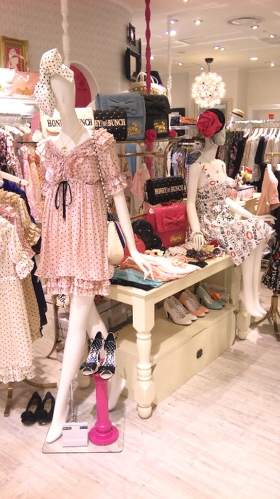 109系のショップのハニーバンチです。「ハニーバンチ」は恋人という意味を持ったブランドなんだそうです。ショップ内は、ギャル向けの可愛い服やカラフルな服が並んでいました。バックも特徴があり目立つ感じが特徴でした。