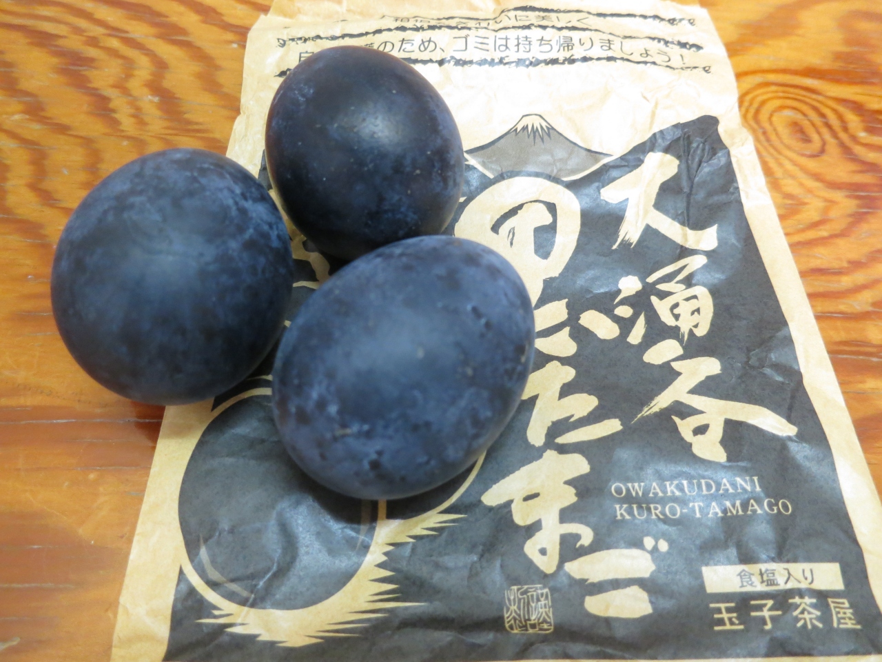 11月下旬の風が強い晴れの日に行きました。箱根ロープウェイで大涌谷駅に着き、まずは外に出てみようと駅を出ましたが、あまりの強風と寒さのため、近くにあったこちらのお店に一旦入りました。ちょうど入り口近くの店員さんが、「本日の黒たまご残り3つ~」とアナウンスしていたので、購入しました。滋養満点で、1つ食べると7年長生きできるという『大涌谷黒たまご』は5個入りで¥500でした。絵に描いたように真っ黒で、まだほかほか(熱々)でした。しばらくは、大涌谷散策中にほっかいろ代わりにしました。散策後にいただきましたが、真っ黒な殻の中は白く、黄身は真っ黄色で、ふつうのゆで卵よりも濃厚な味がし、美味しかったです。娘たちも美味しい美味しいと何個も食べていました。