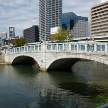 中之島バラ園に架かる橋はその名の通り、ばらぞの橋。バラ園には300種以上のバラの花が咲き誇るそうですが、私が訪ねた時は三分咲きでした。バラに囲まれた園内にアーチ型の石橋は雰囲気にピッタリ合っていますね。橋を渡ると芝生広場へと抜けます。