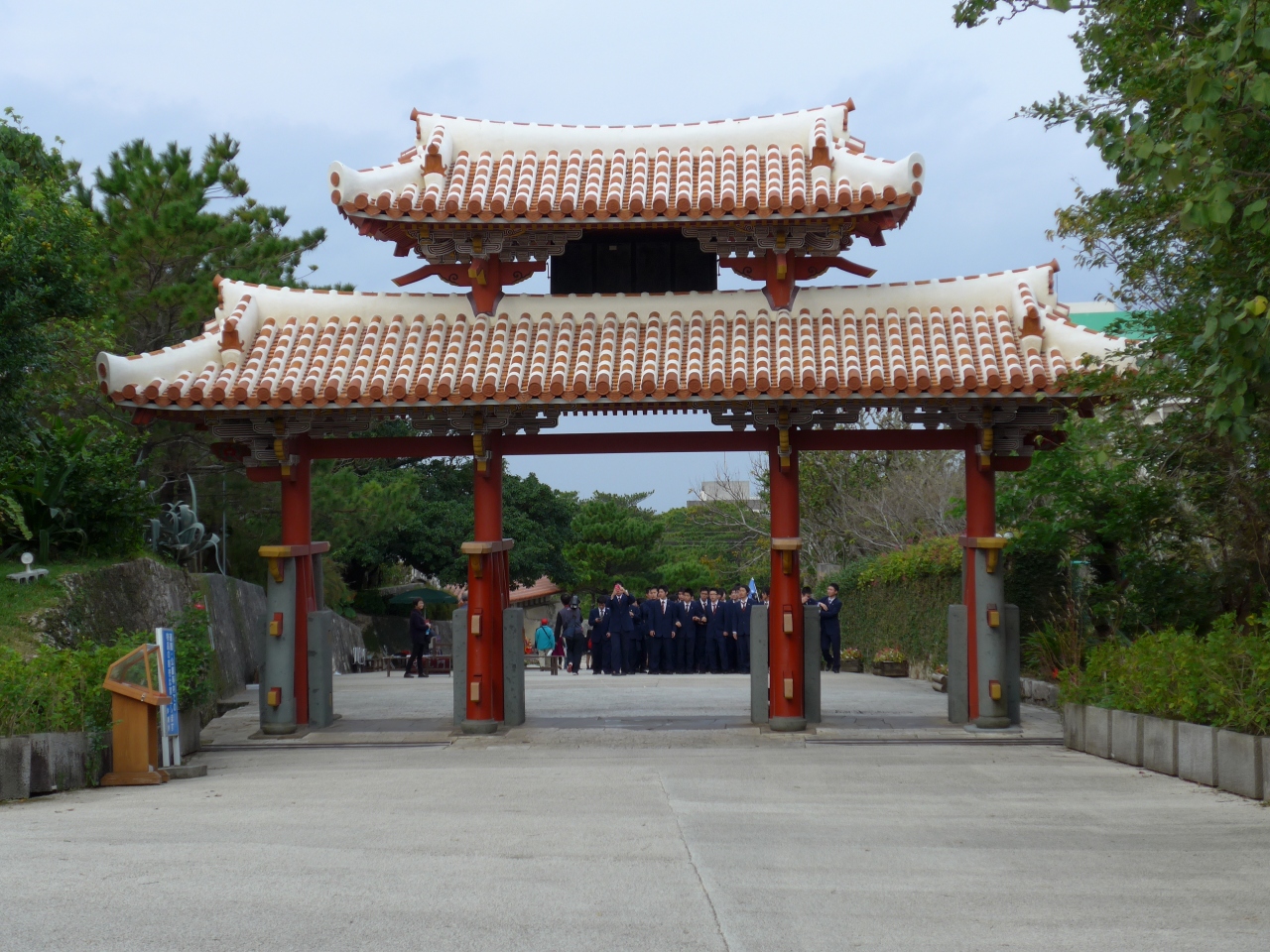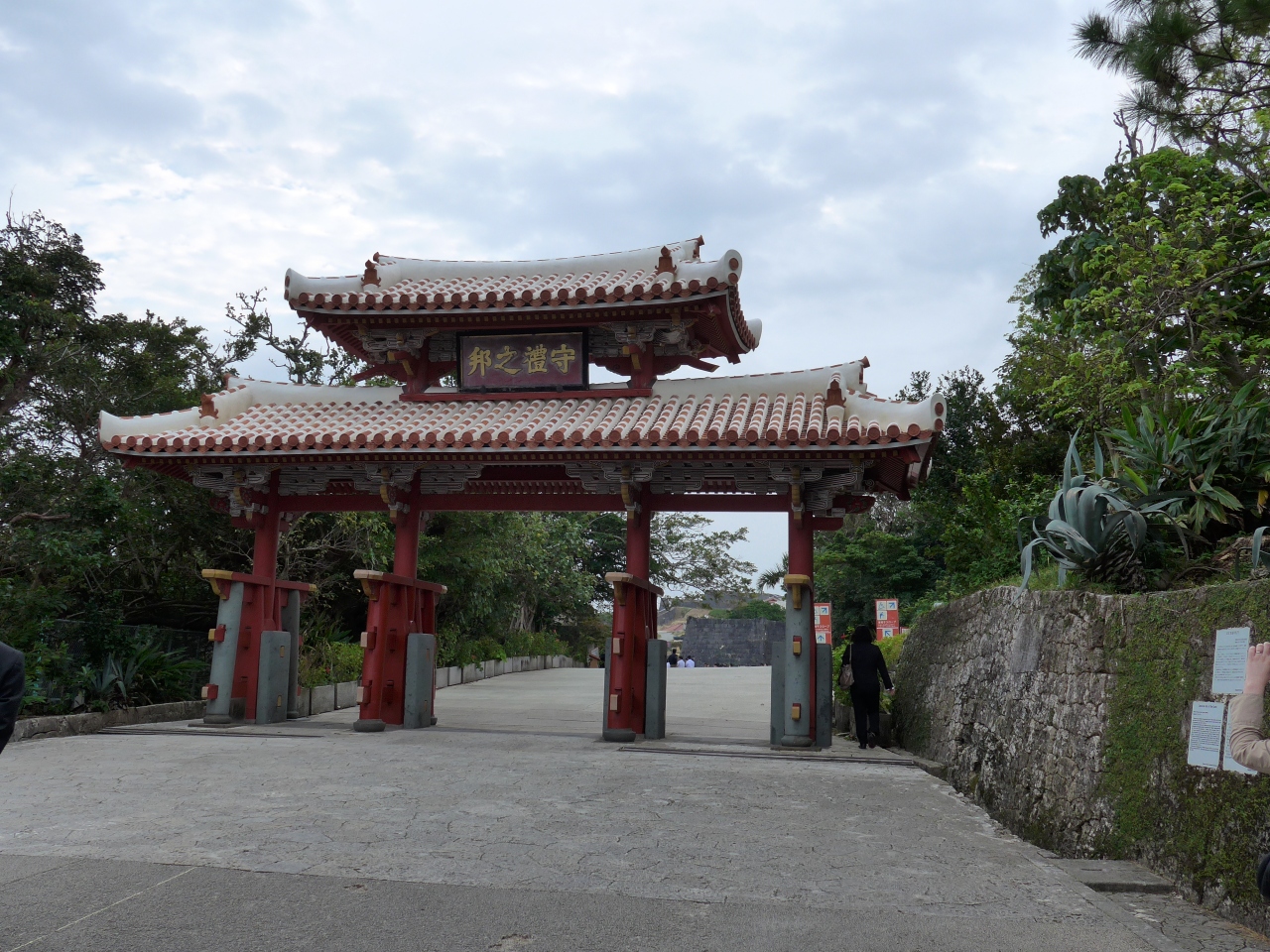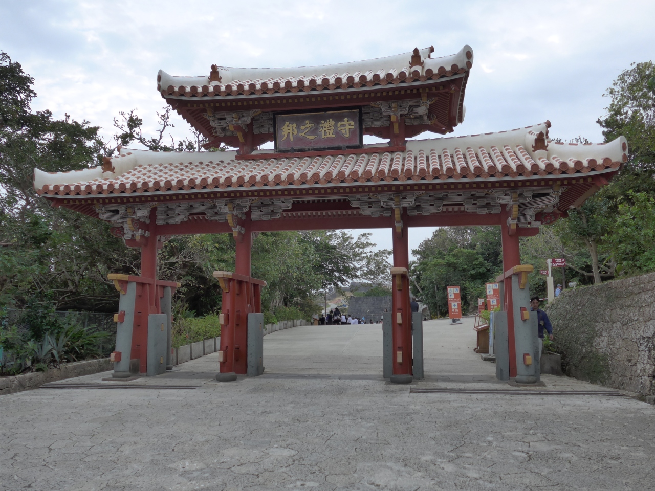 首里城見学・団体バスで訪れると最初の入り口にある「守礼門」は首里城「歓会門」の東側にあります。首里城の重要なお客様を迎え入れる大手門の位置づけです。柱は4本あり二重屋根で出来ていて瓦は赤い色をしています。世界大戦の際、沖縄戦で大切な歴史的な門は焼失したが、1958年に再建され、1972年には沖縄県指定有形文化財となっている。