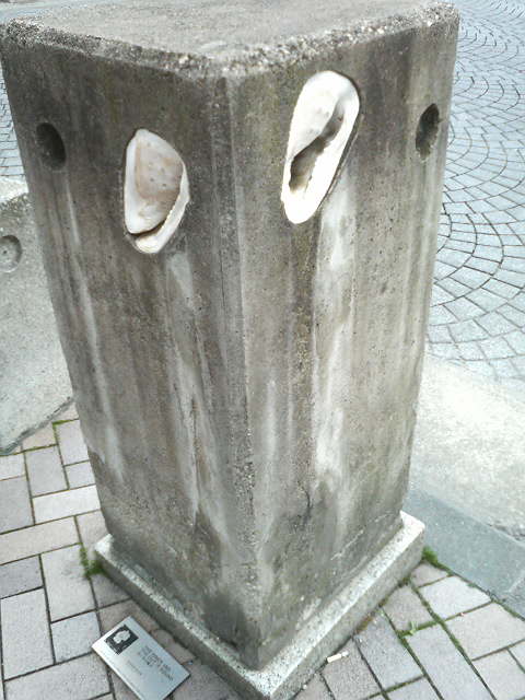 一見ただの歩道沿いの柱と思いきや、口のようなもの(巻き貝の口だそうです)がついていて、見落としそうになります。
