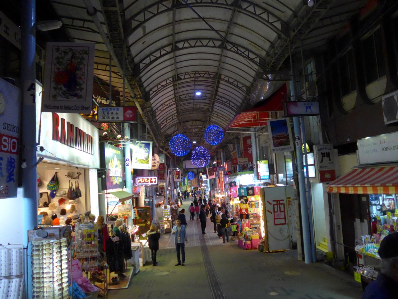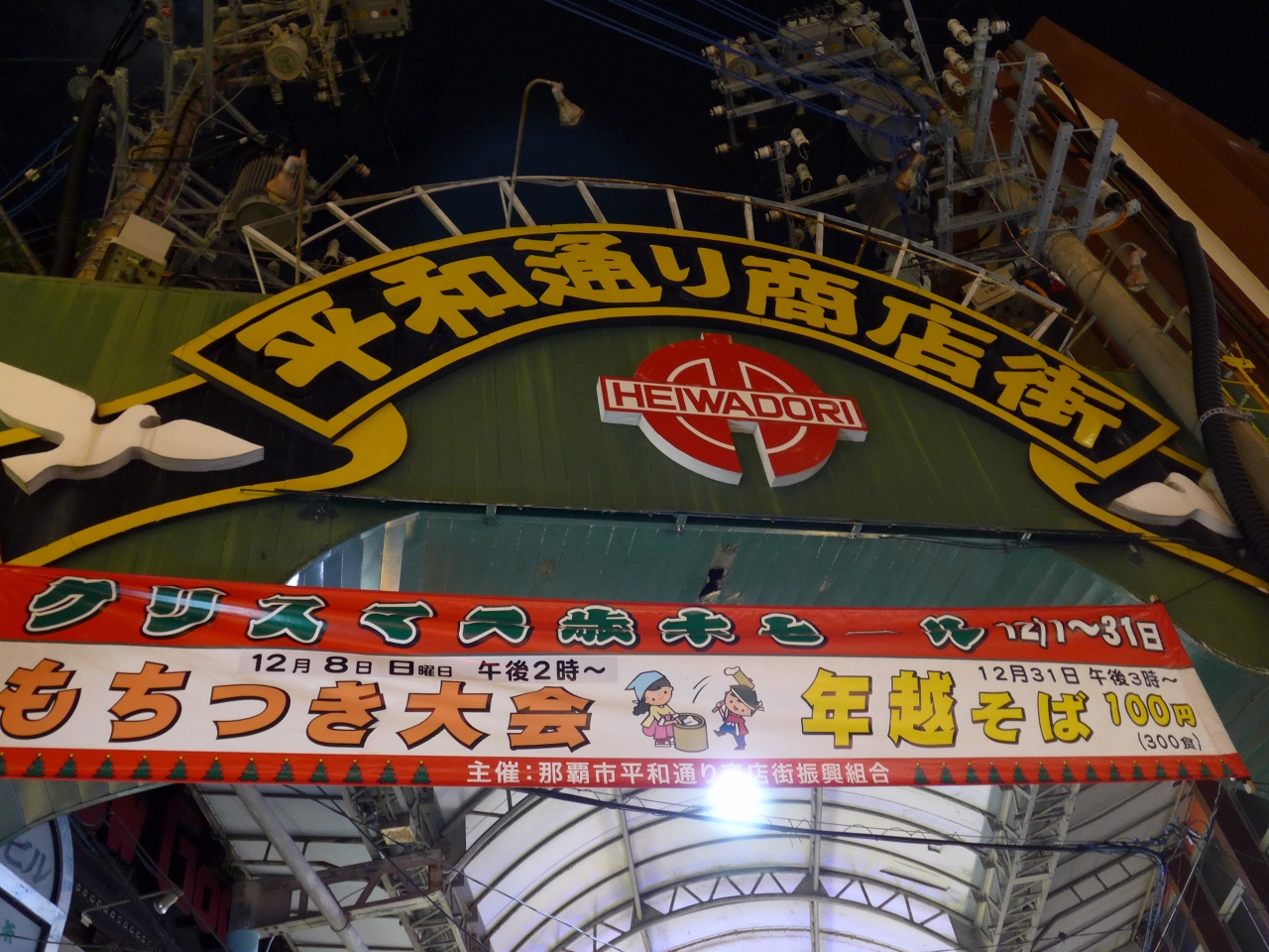 平和通商店街は沖縄・那覇空港に着いてからモノレールの「ゆいレール」に8晩目の「牧志駅」に下車し国際通りを「県庁駅」方面に向って五分ほどのところに入り口があります。近くにはドン・キ・ホーテの店舗や三越百貨店があります。