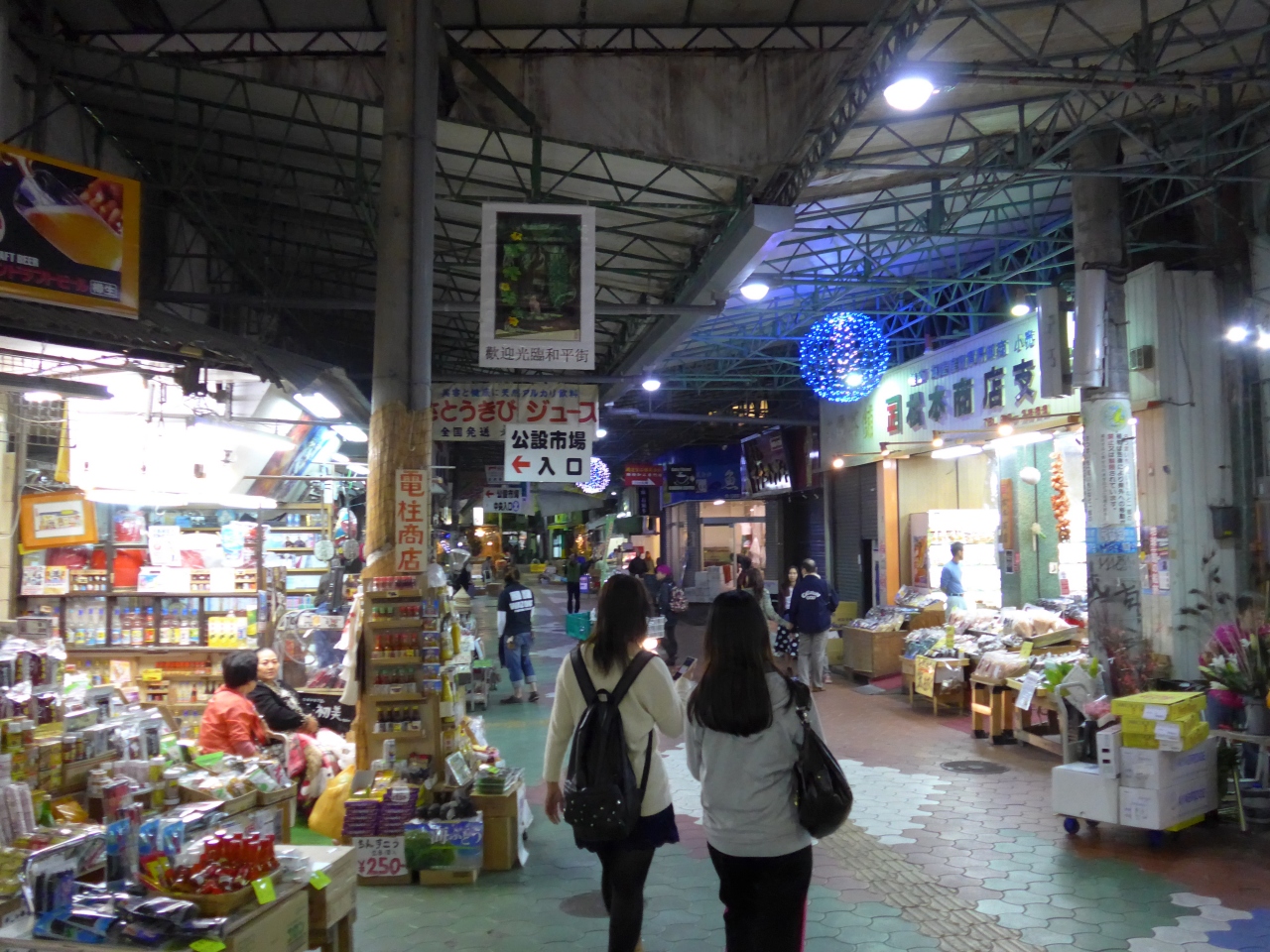 アーケードの商店街に入ると多くのお店が両脇にあり沖縄のお土産品を中心に販売しています。進むと公設牧志市場の入り口が左側にあります。