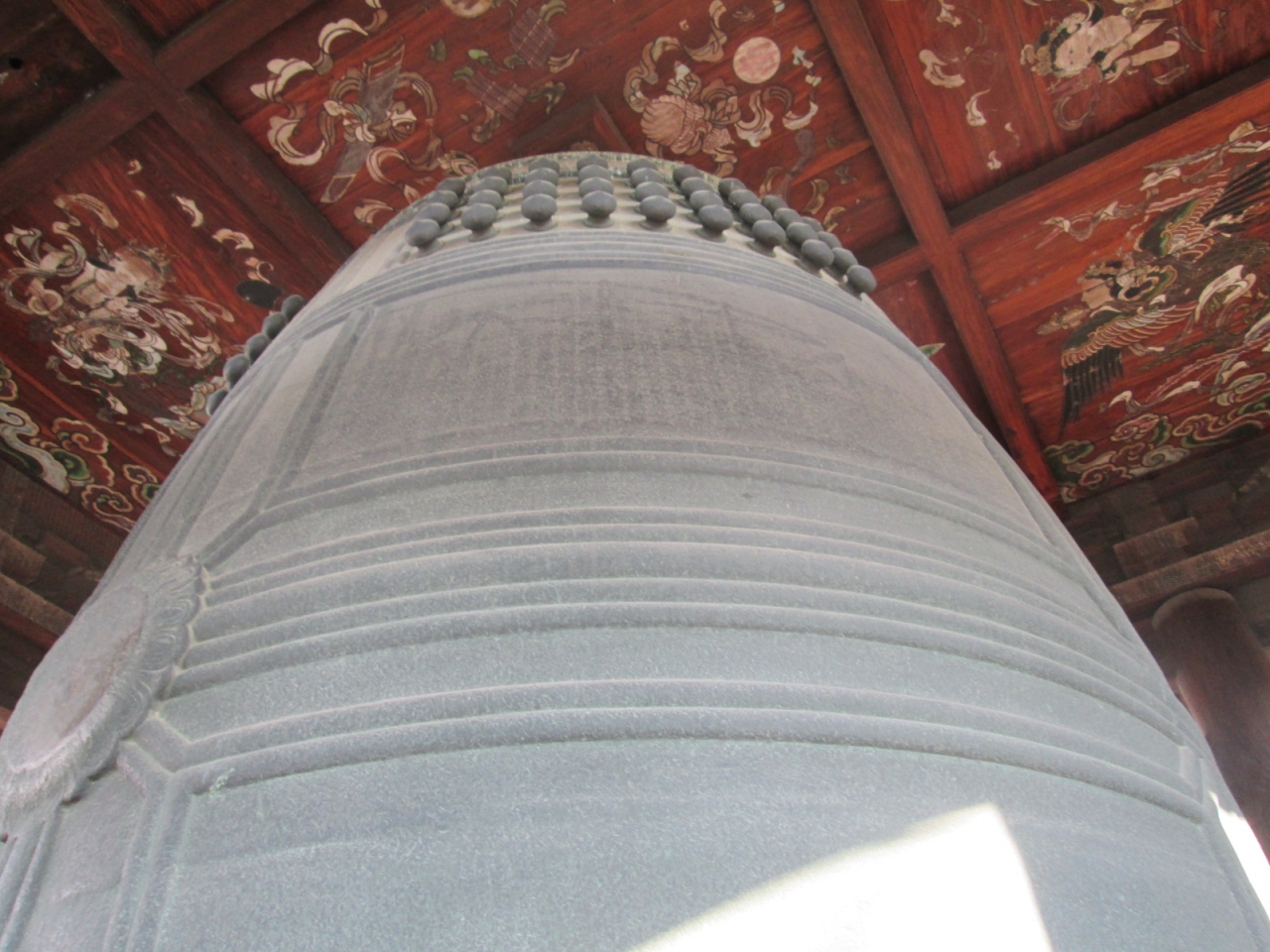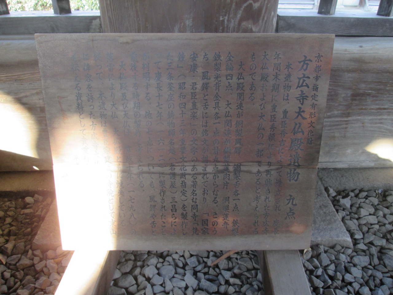 中学校社会科で勉強した”国家安康”・”君臣豊楽”と書かれた鐘を見る目的で訪れました。宿泊先からタクシーで向いましたが、後で確認したら電車の最寄駅はないようです。方広寺に到着すると、敷地内の伽藍は本堂と鐘楼のみで、想像以上に狭さを感じました。かつての方広寺といえば、奈良の東大寺を超える巨大な盧舎那仏・大仏殿があったわけで、現在の方広寺、豊国神社、京都国立博物館、妙法院、智積院から三十三間堂までもが方広寺の敷地であったということですから、ここまで縮小されてしまったことを残念に思います。さて鐘楼には大坂の陣のきっかけとなった鐘が吊るされています。表面には多くの文字が刻まれていますが、”国家安康”・”君臣豊楽”部分には白く印が付いていますが、文字の小ささもあって、はっきり確認することができませんでした。次回は双眼鏡を持参します。鐘楼内部には大仏の一部であったという金属片などがありました。