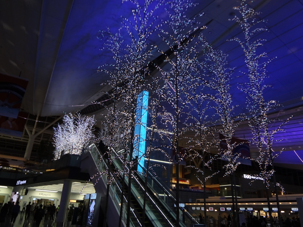 バンコク行きの深夜便利用で訪れました。やはり都心から近いのが大きな利点です。12月だからでしょうか、出発ロビーや江戸舞台などにホワイトのイルミネーションが灯っていて、とてもきれいでした。深夜便の出発が多いだけに、特に出国エリア内は混雑していました。