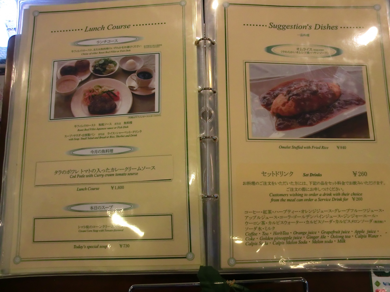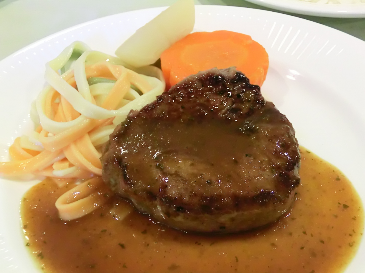 スープ、サラダ、自家製パンかライス、肉料理または魚料理、デザート、飲み物のコースです。私たちが利用した時はスープはミネストローネスープで肉料理は牛フィレロースト、つまりフィレステーキでした。ミディアムからウェルダンの間で焼き加減も聞いてもらえます。普通1600円ぐらいのコースなら、肉料理はチキンになりますよね。牛ステーキの場合は追加料金がかかったりするものです。でも、ここではそういったこともなく、肉料理はちゃんと厚みのあるフィレステーキが出て来ました。メニューに牛脂注入加工肉を使用していると注意書きがしてありましたが、柔らかくてギュッと噛むとジュワっと味が出て来てとても美味しかったです。ソースもつけ合わせも美味しく、満足しました。