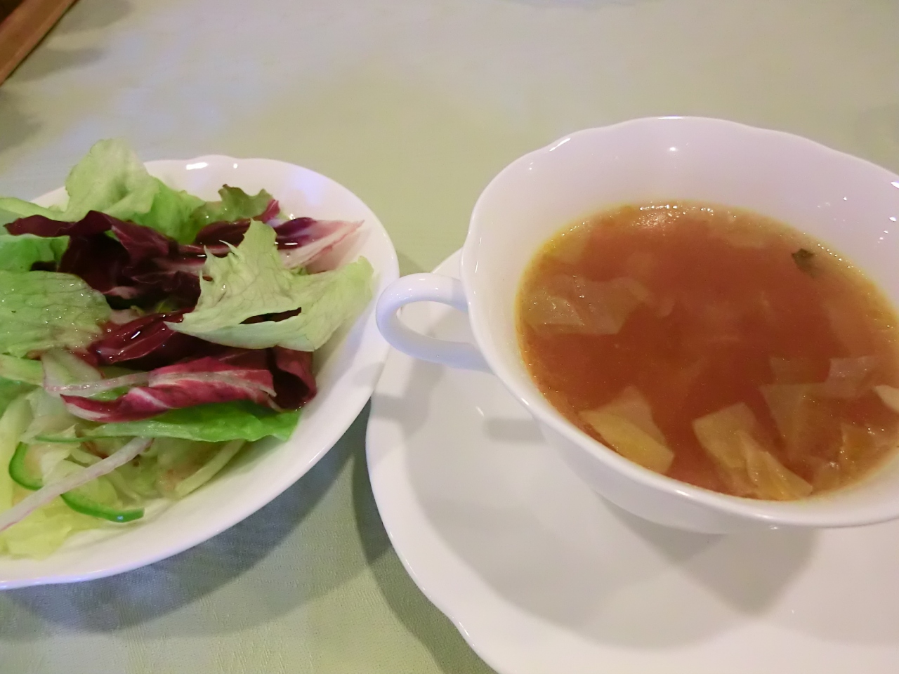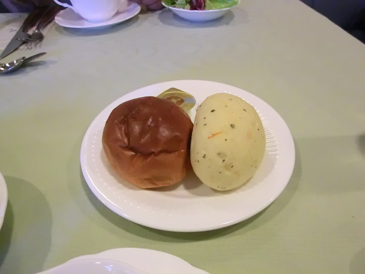 ミネストローネスープはジュがイモやパスタは入っていませんが、それなりに美味しいです。対してサラダだけはちょっと残念でした。レタスが中心で梅じそドレッシング、変わりばえしません。パンはトマトバジル入りのと普通のロールパンみたいなの。温かくふかふかで美味しいです。ライスも美味しかったです。