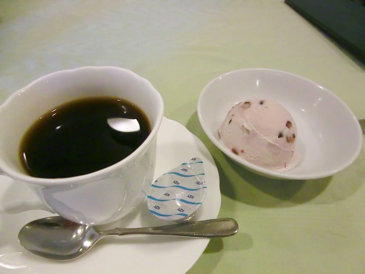 デザートは小豆アイスクリームでした。豆の粒がしっかり入っていて、これも美味しいです。ホットコーヒーは特に美味しいものではありませんでした。