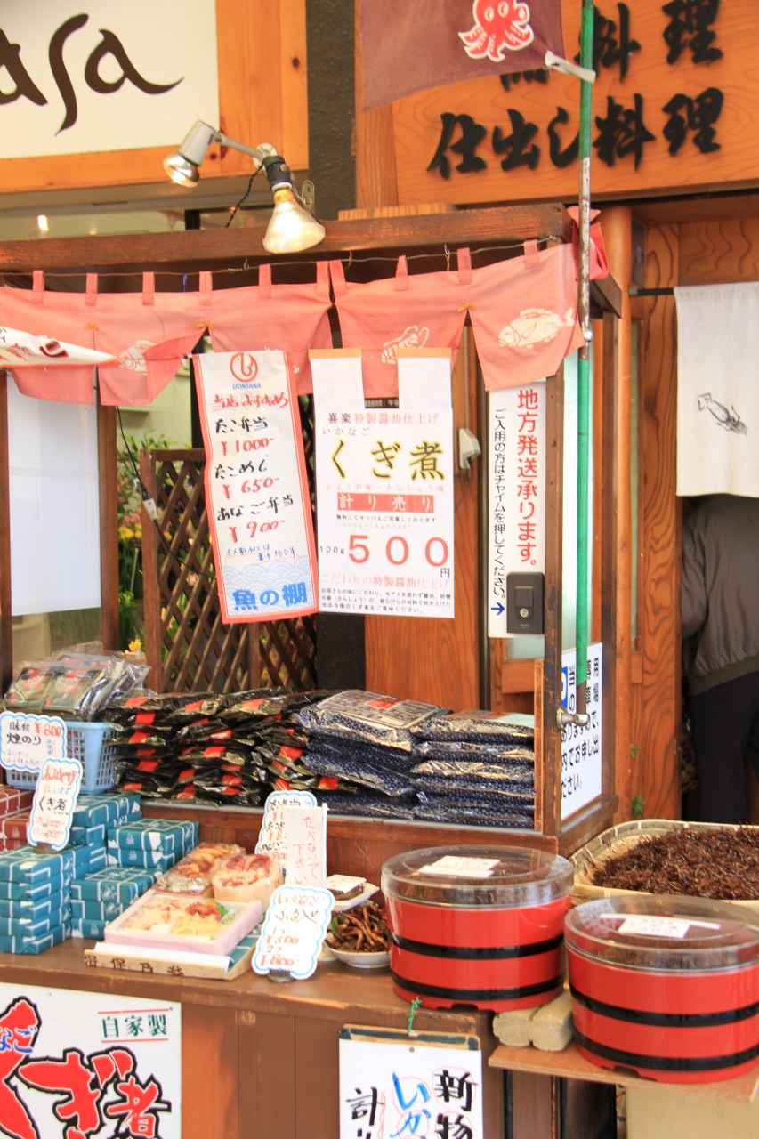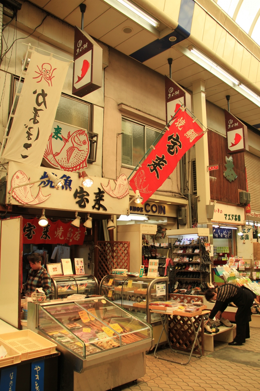商店街の中には食べ物屋、テンプラ屋、もちろん魚屋などが犇めいています。